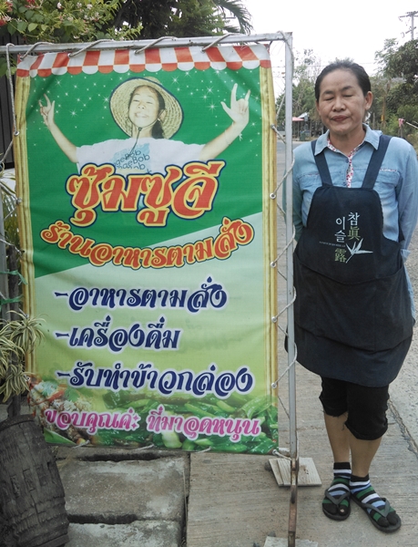 นางสมพร แก้วกล้า เจ้าของร้านอาหารซุ้มซูจี ตำบลเทะเมนชัย ยืนสังเกตุการณ์ขบวนรณรงค์ทะเมนชัย สู่ตำบลน้ำเปล่า อยู่บริเวณหน้าร้าน