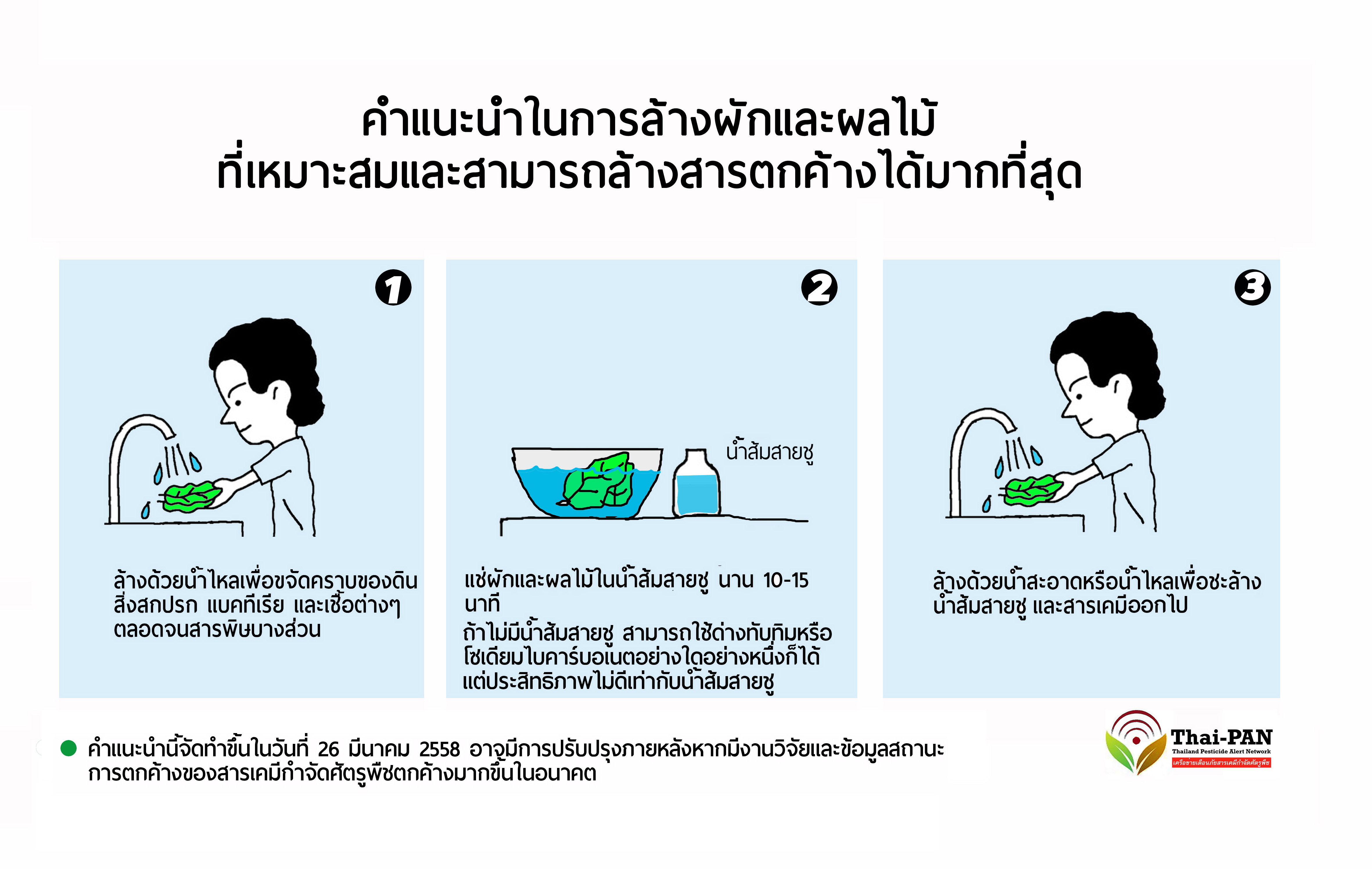 นางสาวอังคณา กล่าวด้วยว่า เครือข่ายเตือนภัยสารเคมีกำจัดศัตรูพืชได้ให้คำแนะนำในการล้างผักผลไม้สำหรับประชาชนที่สามารถลดสารเคมีให้ได้มากที่สุดเท่าที่เป็นไปได้ มี 3 ขั้นตอน ดังต่อไปนี้