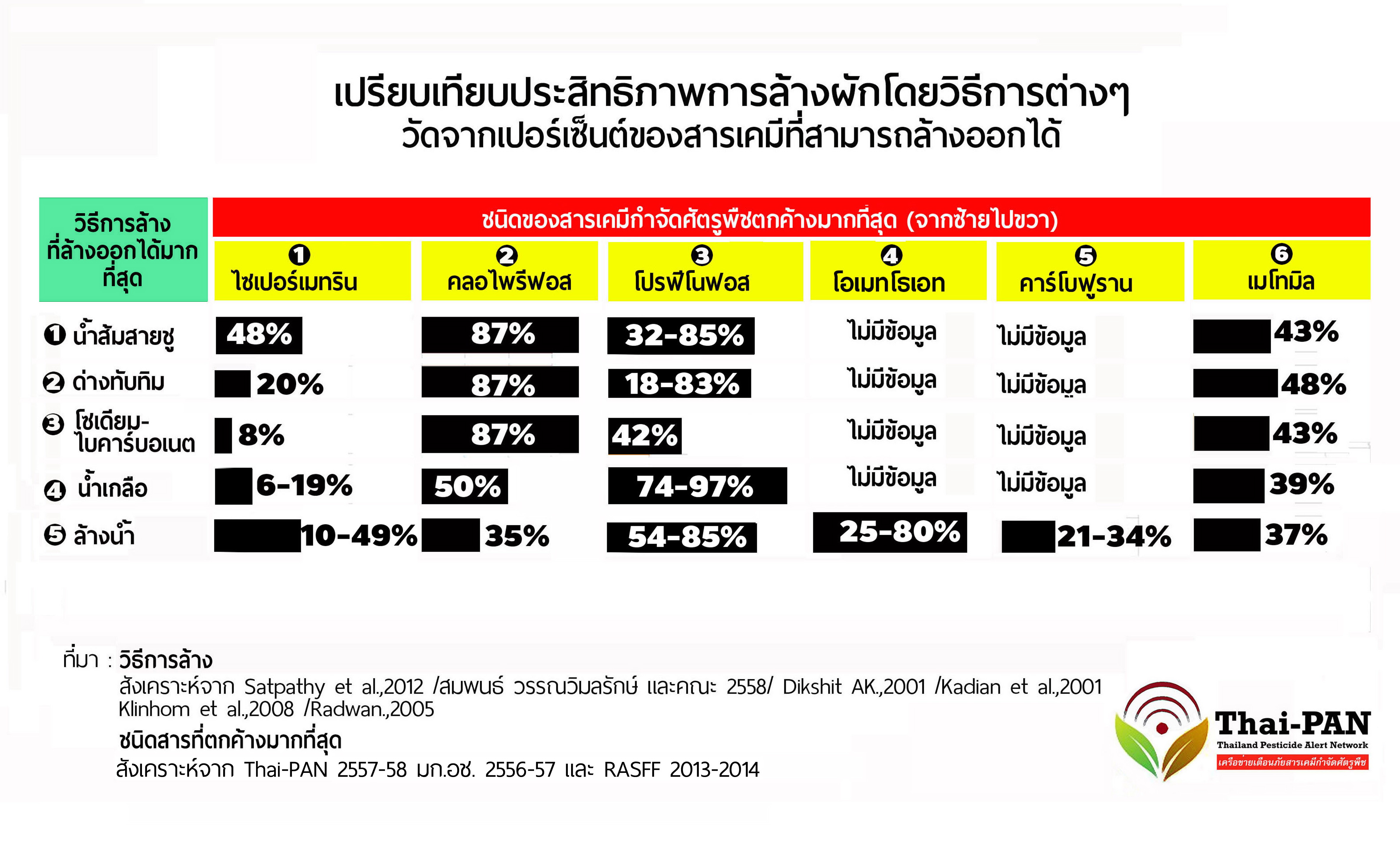 “การศึกษายังพบการล้างในทุกวิธีมีการตกค้างของสารเคมีที่พบบ่อยมากที่สุดในอันดับแรก คือ ไซเปอร์เมทรินสูงค่อนข้างมาก โดยวิธีการล้างที่ดีที่สุดยังสามารถลดการตกค้างได้ประมาณครึ่งหนึ่งเท่านั้น” นักวิจัยอิสระ กล่าว และว่าคำแนะนำของสำนักงานคณะกรรมการอาหารและยา (อย.) ซึ่งให้ใช้โซเดียมไบคาร์บอเนตหรือเบคกิ้งโซดาจะสามารถลดการตกค้างได้ 90-95 เปอร์เซ็นต์แล้วแต่ชนิดผักนั้น ไม่สอดคล้องกับรายงานนี้