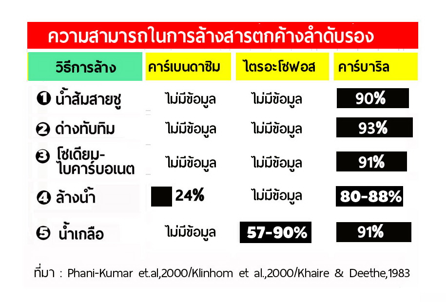 1) การล้างด้วยน้ำส้มสายชู เป็นวิธีการที่ดีที่สุด เพราะลดสารที่ตกค้างมากที่สุดได้ 48% สารลำดับที่สองได้ 87% และสารลำดับที่สามได้ 32-85%