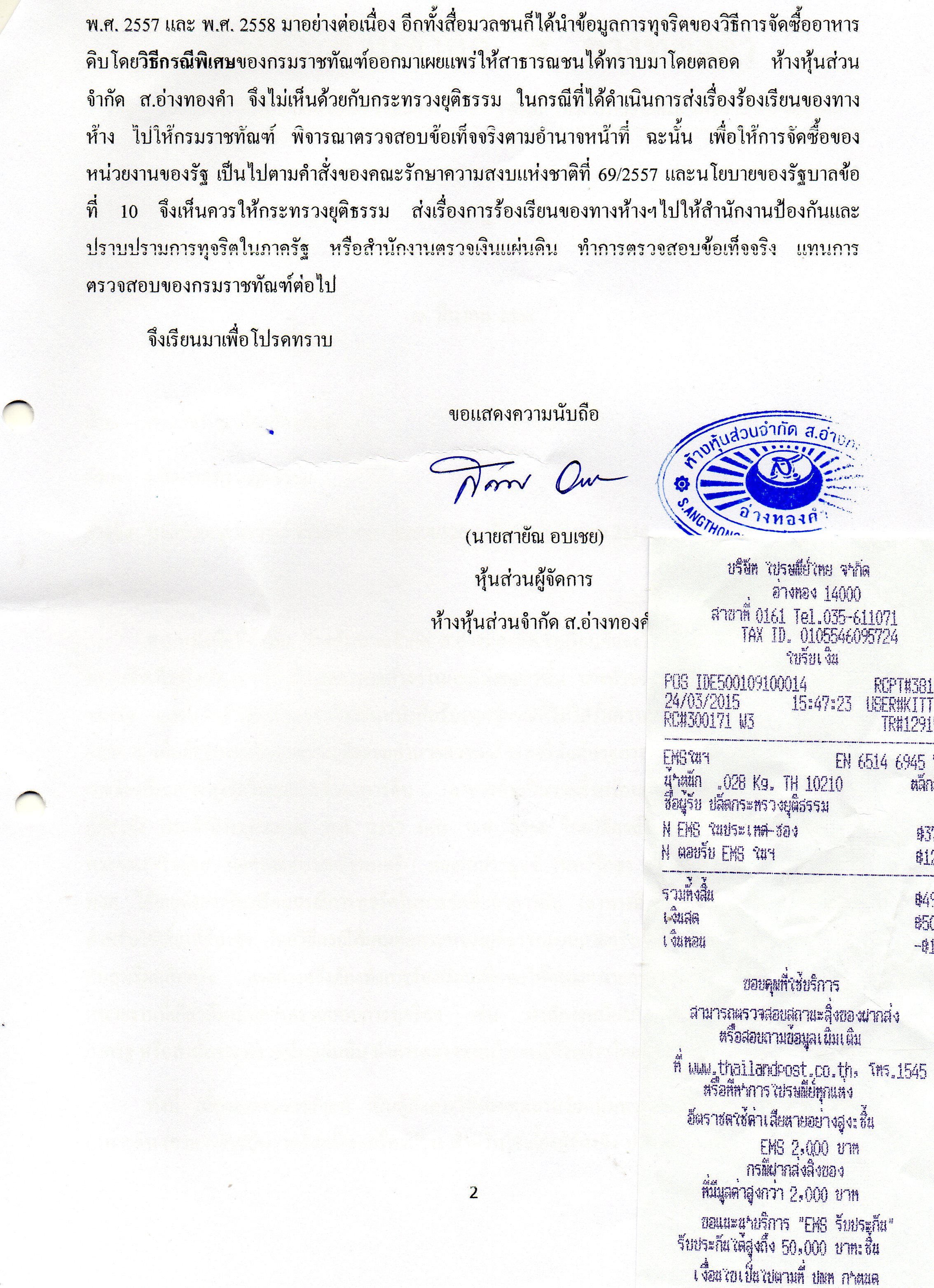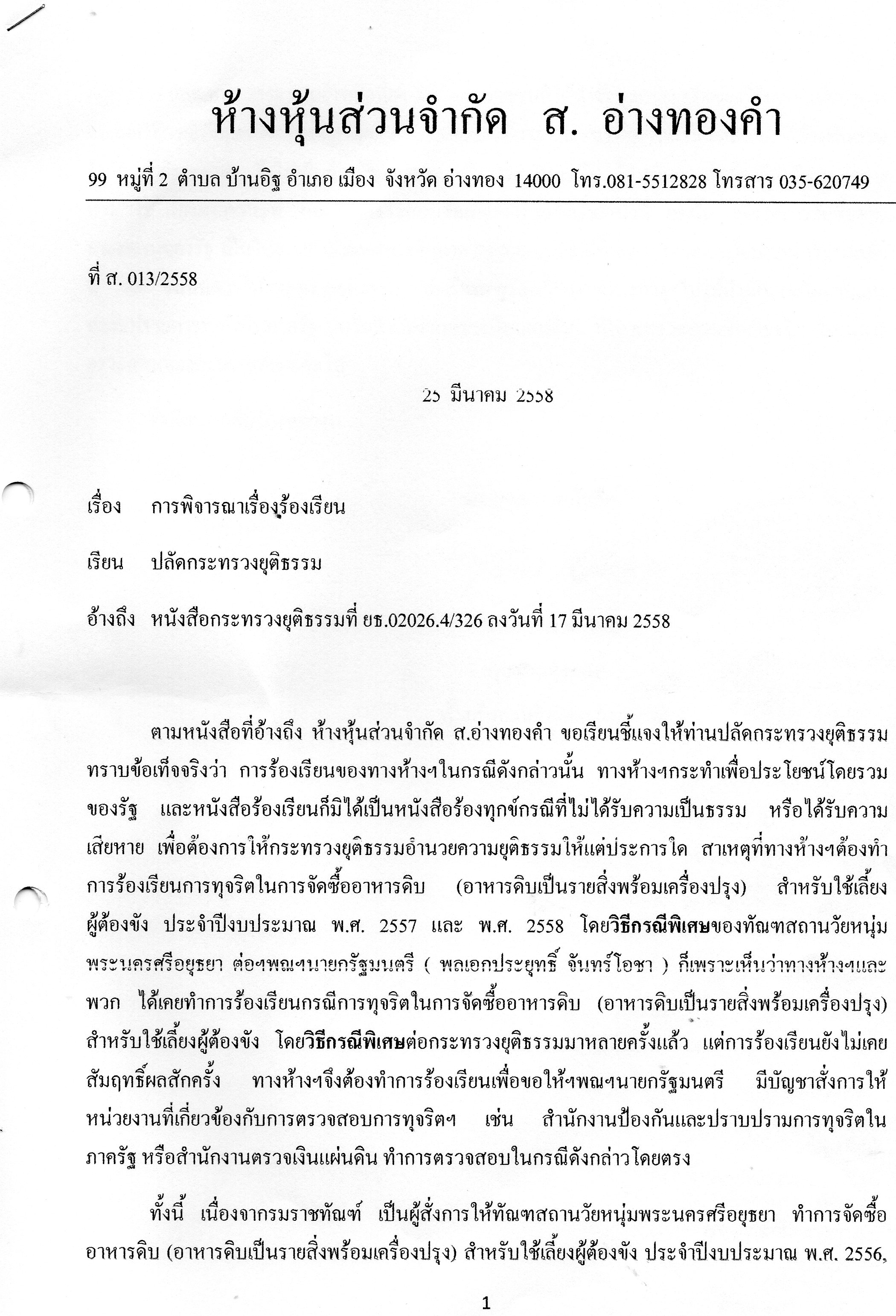 “ตามหนังสือที่อ้างถึง ห้างหุ้นส่วนจำกัด ส.อ่างทองคำ ขอเรียนชี้แจงให้ท่านปลัดกระทรวงยุติธรรมทราบข้อเท็จจริงว่า การร้องเรียนของทางห้างฯในกรณีดังกล่าวนั้น ทางห้างฯกระทำเพื่อประโยชน์โดยรวมของรัฐ และหนังสือร้องเรียนก็มิได้เป็นหนังสือร้องทุกข์กรณีที่ไม่ได้รับความเป็นธรรม หรือได้รับความเสียหาย เพื่อต้องการให้กระทรวงยุติธรรมอำนวยความยุติธรรมให้แต่ประการใด สาเหตุที่ทางห้างฯต้องทำการร้องเรียนการทุจริตในการจัดซื้ออาหารดิบ (อาหารดิบเป็นรายสิ่งพร้อมเครื่องปรุง) สำหรับใช้เลี้ยงผู้ต้องขัง ประจำปีงบประมาณ พ.ศ.2557 และ พ.ศ.2558 โดยวิธีกรณีพิเศษของทัณฑสถานวัยหนุ่มพระนครศรีอยุธยา ต่อ ฯพณฯ นายกรัฐมนตรี (พลเอกประยุทธ์ จันทร์โอชา) ก็เพราะเห็นว่าทางห้างฯ และพวกได้เคยทำการร้องเรียนกรณีการทุจริตในการจัดซื้ออาหารดิบ (อาหารดิบเป็นรายสิ่งพร้อมเครื่องปรุง) สำหรับใช้เลี้ยงผู้ต้องขัง โดยวิธีกรณีพิเศษต่อกระทรวงยุติธรรมมาหลายครั้งแล้ว แต่การร้องเรียนยังไม่เคยสัมฤทธิ์ผลสักครั้ง ทางห้างฯจึงต้องทำการร้องเรียนเพื่อขอให้ ฯพณฯนายกรัฐมนตรี มีบัญชาสั่งการให้หน่วยงานที่เกี่ยวข้องกับการตรวจสอบการทุจริตฯ เช่น สำนักงานป้องกันและปราบปรามการทุจริตในภาครัฐ หรือสำนักงานตรวจเงินแผ่นดิน ทำการตรวจสอบในกรณีดังกล่าวโดยตรง