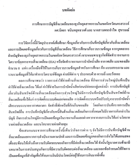 การวิจัยครั้งนี้มีวัตถุประสงค์เพื่อศึกษา ข้อมูลเกี่ยวกับการบันทึกบัญชีเกี่ยวกับสิ่งแวดล้อมและการเปิดเผยข้อมูลเกี่ยวกับการบัญชีสิ่งแวดล้อม วิธีการศึกษาเก็บรวบรวมข้อมูล จากบุคคลากรฝ่ายบัญชีของธุรกิจอุตสาหกรรมในเขตจังนครสวรรค์ เจาะจงเฉพาะธุรกิจที่จัดทำรายงานการวิเคราะห์ผลกระทบสิ่งแวดล้อม (EIA) หรือจัดทำรายงานการบำบัดน้ำเสีย อากาศเสีย และของเสียจำนวน 8 แห่ง เครื่องมือที่ใช้ในการเก็บรวบรวมสำหรับการศึกษา คือ แบบสอบถาม และรวบรวมข้อมูลที่ได้มาทำการวิเคราะห์ข้อมูล ค่าสถิติต่างๆ ประกอบด้วยความถี่ และร้อยละ