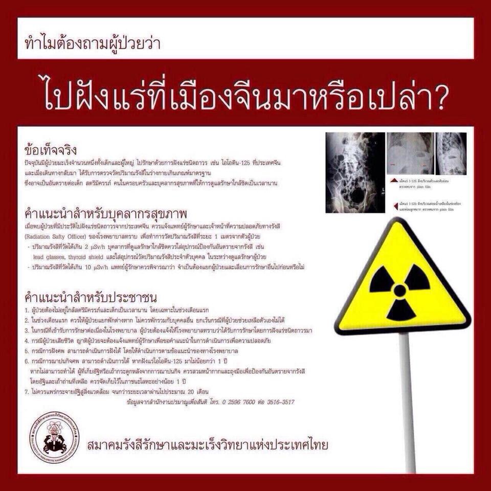 สมาคมรังสีรักษาและมะเร็งวิทยาฯ ออกคำแนะนำสำหรับบุคลากรสุขภาพ เมื่อพบผู้ป่วยที่มีประวัติไปฝังแร่ชนิดถาวรจากจีน ควรแจ้งแพทย์ผู้รักษา-เจ้าหน้าที่ความปลอดภัยทางรังสีทราบ เพื่อทำการวัดปริมาณรังสีที่ระยะ 1 เมตรจากตัวผู้ป่วย