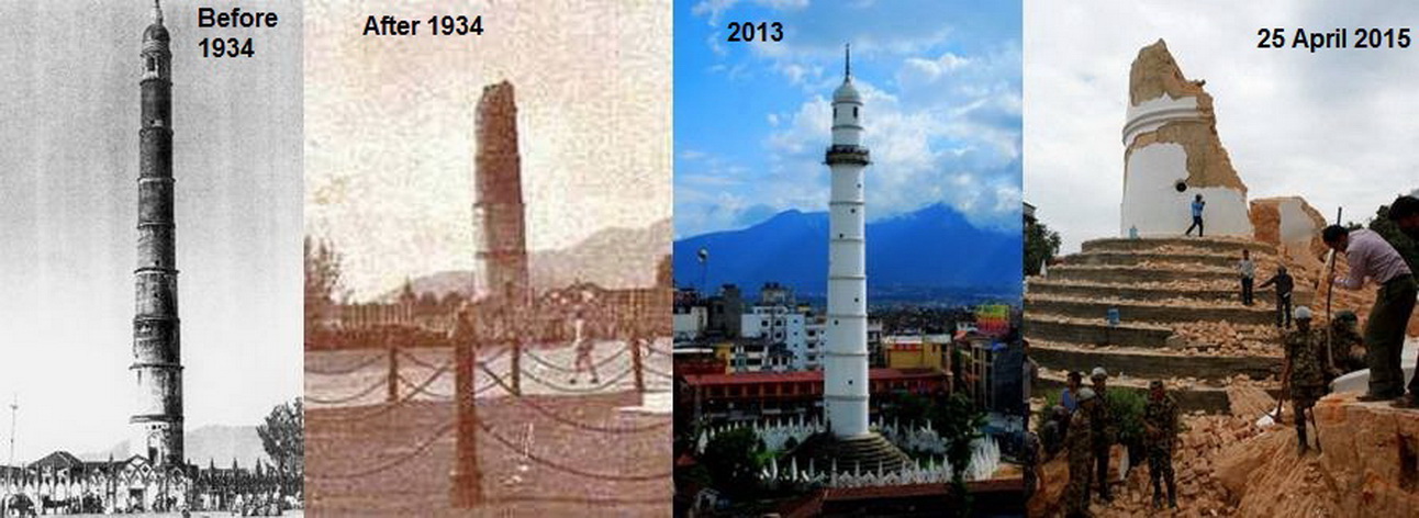 โดยแผ่นดินไหวเมื่อวันที่ 25 เมษายนที่ผ่านมานั้นน่าจะเกิดคนละโซนกับเมื่อปี ค.ศ. 1934 เมื่อ 81 ปีที่แล้ว สิ่งที่บ่งชี้ว่าเมื่อปี ค.ศ. 1833 นั้นเคยเกิดแผ่นดินไหวก็คือ หอคอยธาราฮารา ซึ่งเป็นหอคอยขนาดใหญ่ใจกลางเมืองกาฐมาณฑุที่พังถล่มมาจากทั้งสามเหตุการณ์ในปี ค.ศ. 1833, 1934 และ 2015