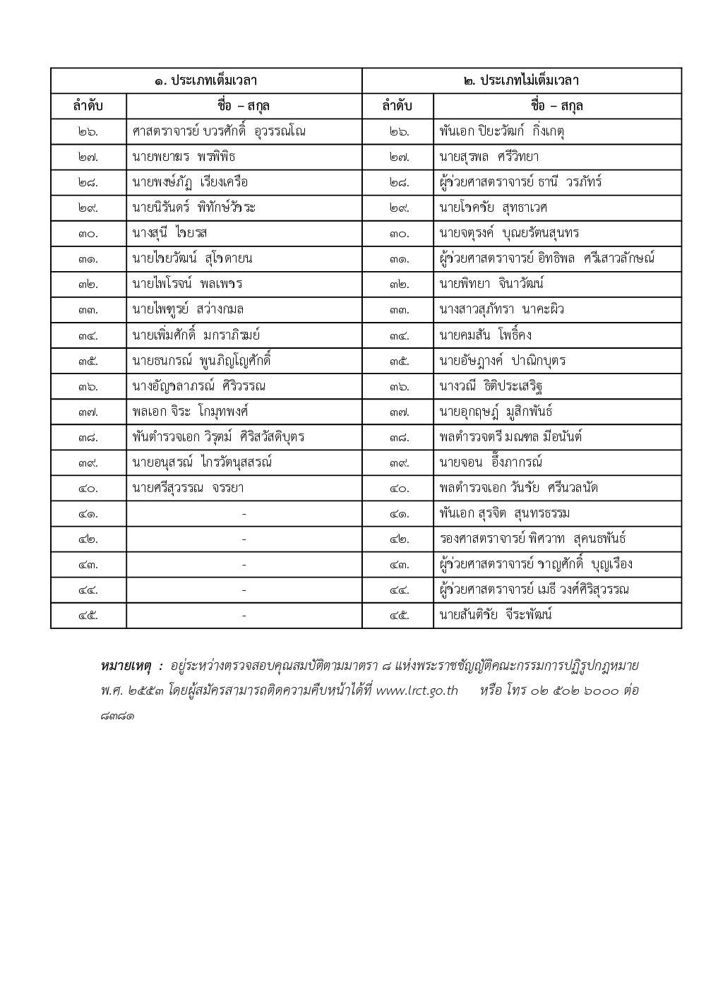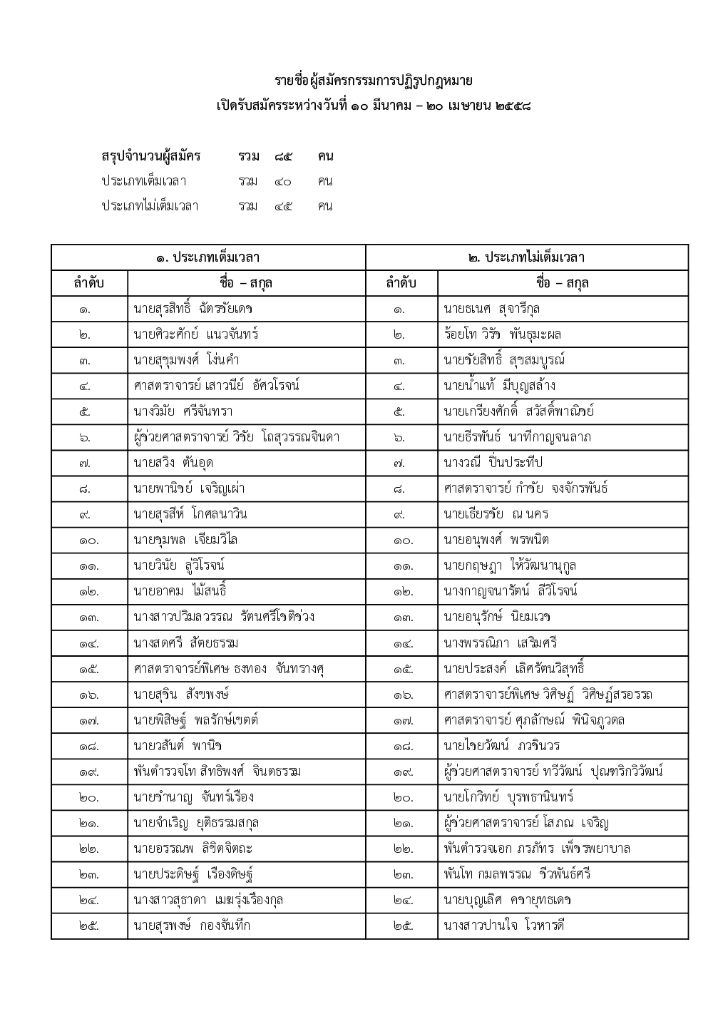คปก.การประกาศรายชื่อผู้สมัครกรรมการปฏิรูปกฎหมาย รวมทั้งสิ้น 85 คน แบ่งเป็นประเภทเต็มเวลา 40 คน และ ประเภทไม่เต็มเวลา 45 คน