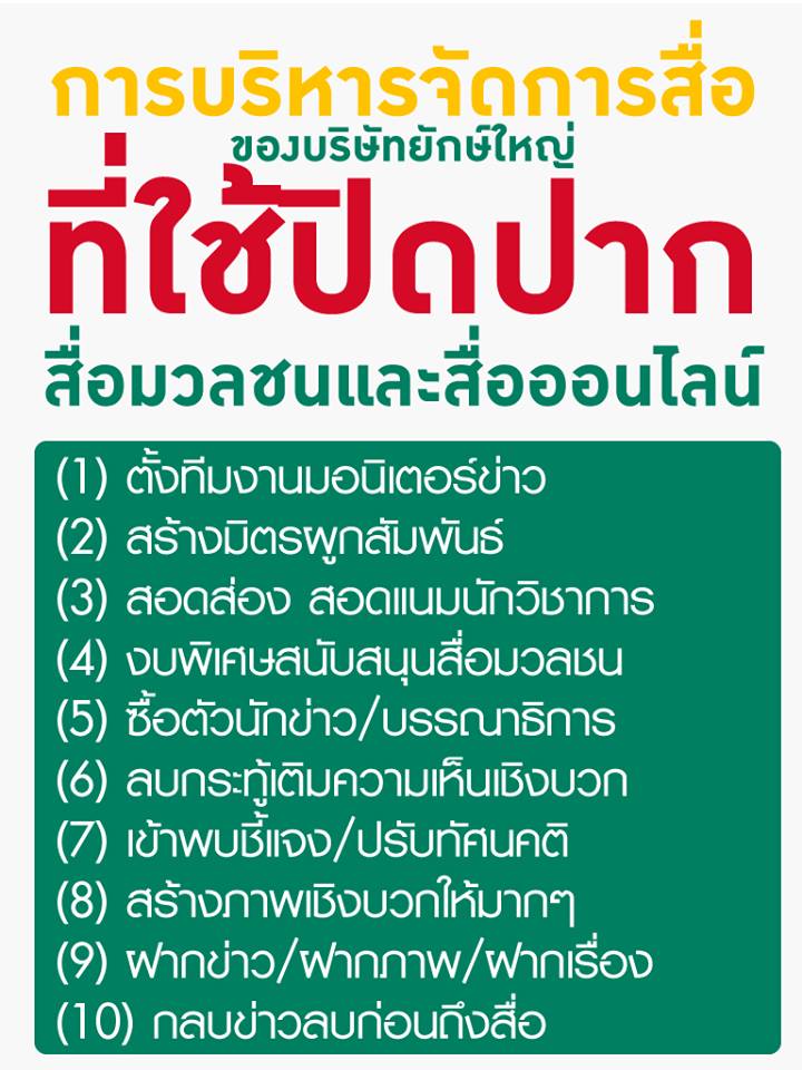 นี่คือ 10 กลวิธีของบริษัทใหญ่ ในการบริหารจัดการสื่อ ที่อาจเป็นวิธีการปกติธรรมดาตามตำราพีอาร์ ไปสู่การเป็นวิชาการที่ใช้ในการปิดปากสื่อและคนในสังคมออนไลน์ โดยที่คุณไม่รู้เลย แต่ก็มีการทำแบบนี้กันจริงในทางปฎิบัติ