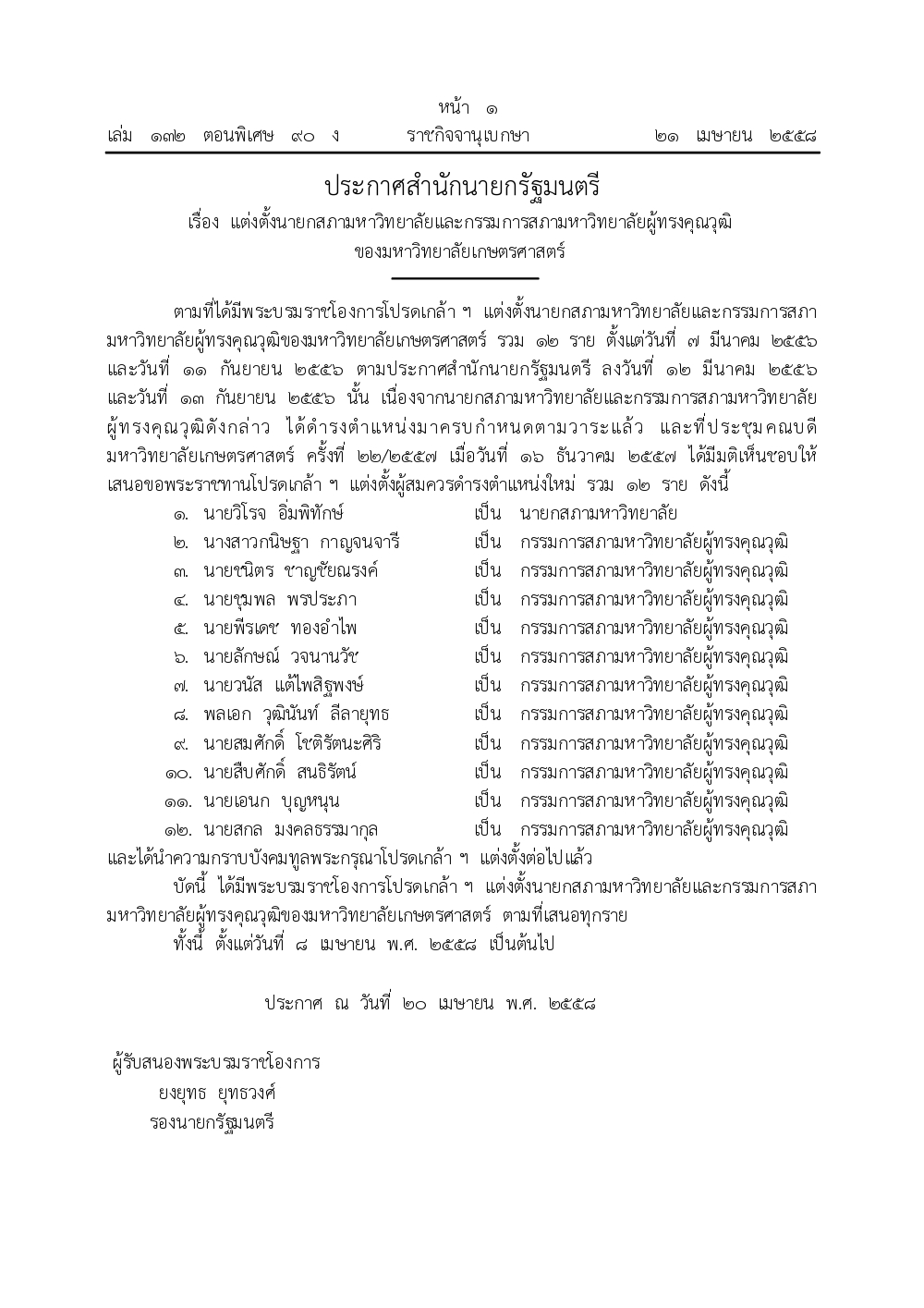 อย่างไรก็ตาม ในการประชุมสภามก. 10 เมษายน 2558 เพื่อพิจารณาเรื่องการเสนอขอโปรดเกล้าฯ แต่งตั้งอธิการบดีมก. ตามหนังสือ สกอ. ด่วนที่สุด ส่งถึงนายกสภามก. ที่แจ้งว่า รัฐมนตรีว่าการกระทรวงศึกษาธิการมีบัญชาให้แจ้งสภามก.พิจารณาทบทวนการเสนอขอโปรดเกล้าฯ แต่งตั้งอธิการบดีอีกครั้งหนึ่งนั้น