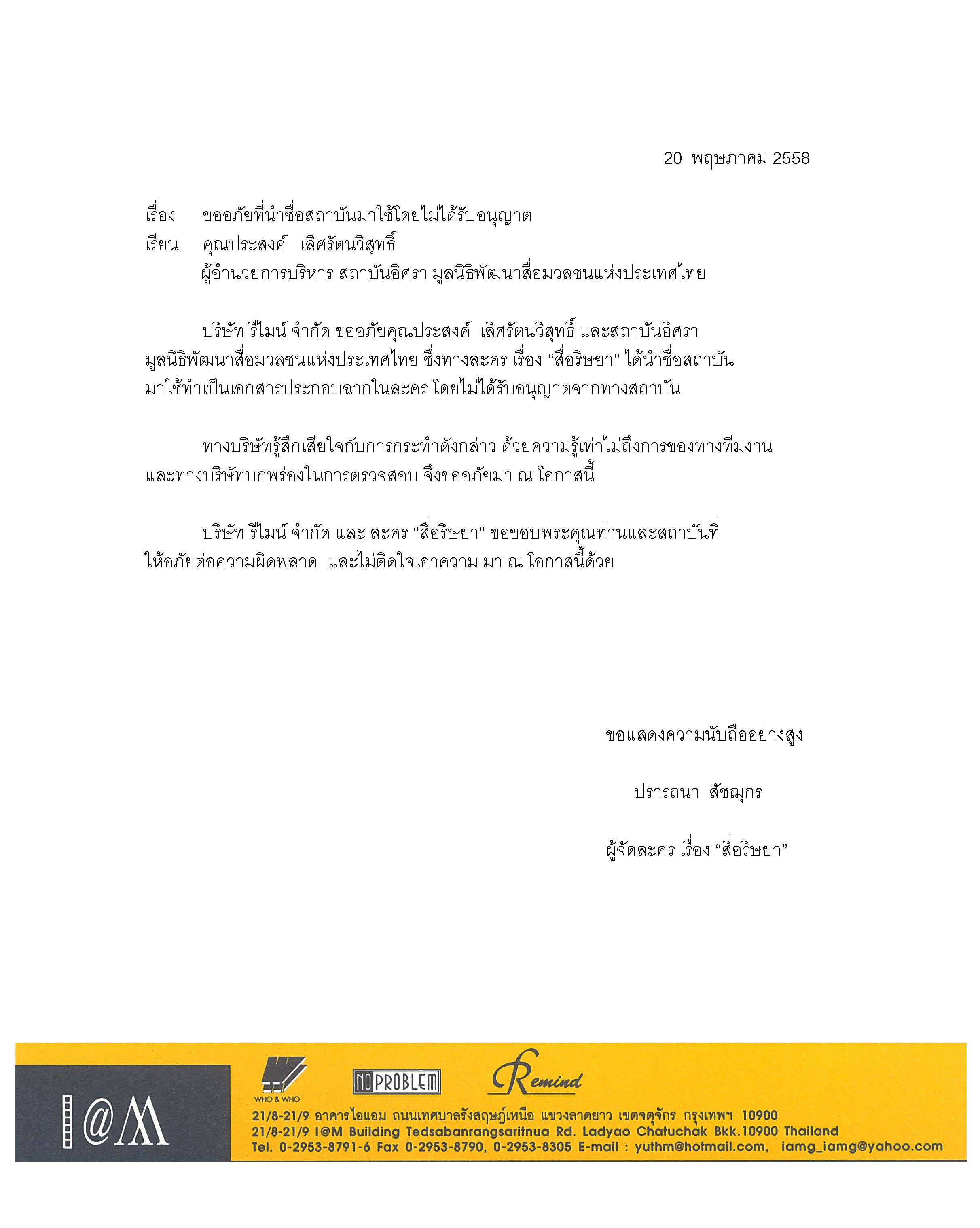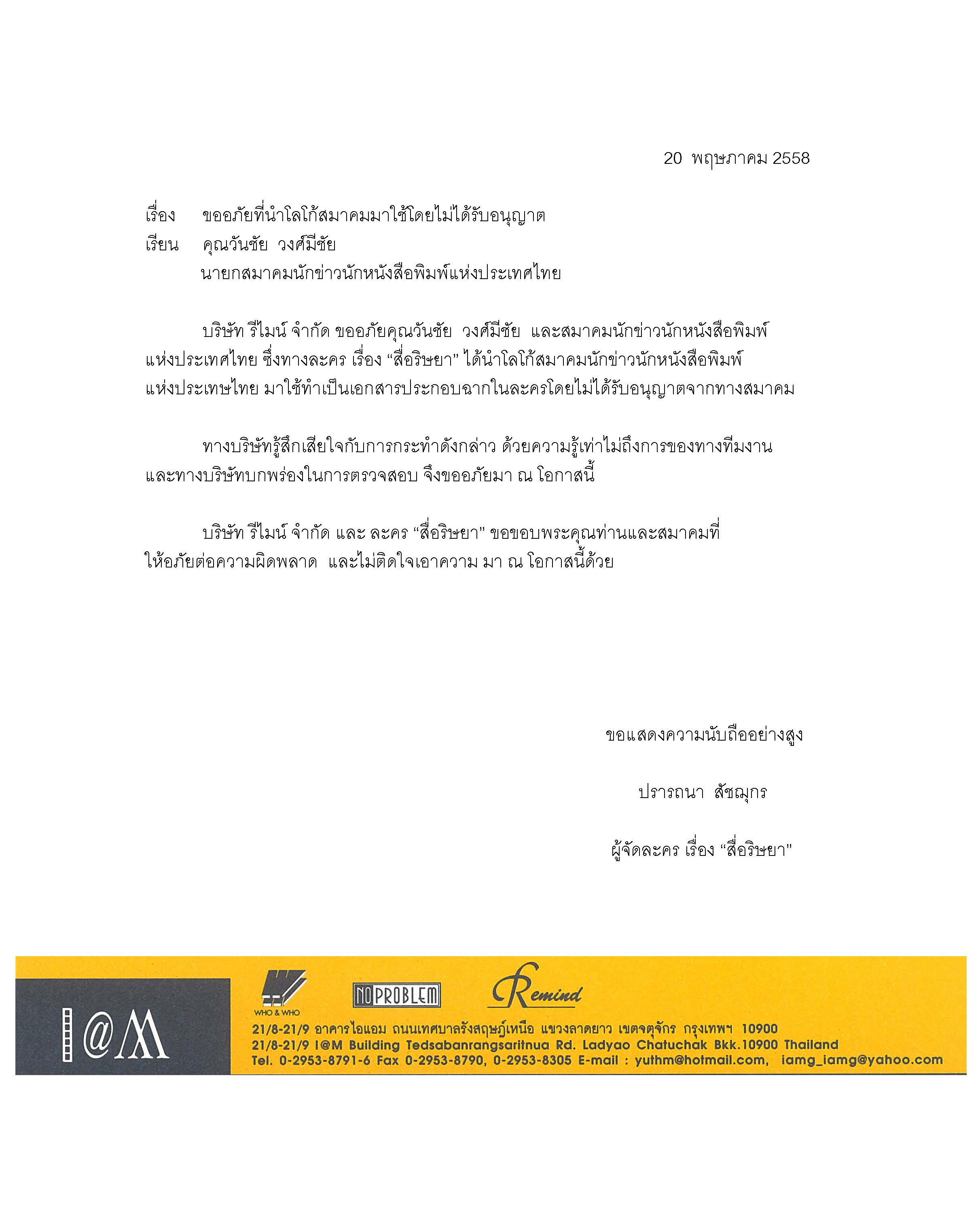บริษัท รีไมน์ จำกัด ขออภัยสถาบันอิศรา มูลนิธิพัฒนาสื่อมวลชนแห่งประเทศไทย และสมาคมนักข่าวนักหนังสือพิมพ์แห่งประเทศไทย ซึ่งทางละครเรื่อง ‘สื่อริษยา’ ได้นำชื่อของสถาบันอิศรา และโลโก้สมาคมนักข่าวฯ มาใช้ทำเป็นเอกสารประกอบฉากในละคร โดยไม่ได้รับอนุญาต