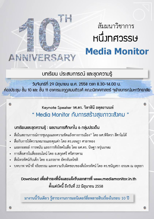 เชิญร่วมสัมมนาวิชาการ "หนึ่งทศวรรษ Media Monitor: บทเรียน ประสบการณ์ และชุดความรู้"