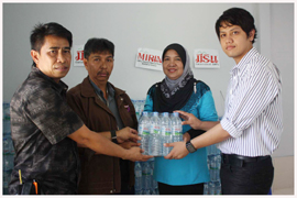 2 กรรมการผู้จัดการบริษัทเพชรน้ำใส จำกัด ต.วังพญา อ.รามัน จ.ยะลา ผู้ผลิตน้ำดื่มน้ำแร่ธรรมชาติ มอบน้ำดื่มบรรจุขวดจำนวน 100 โหล ให้กับเลขาธิการสมาคมหนังสือพิมพ์ภาคใต้แห่งประเทศไทย เพื่อนำไปสมทบบริจาคแก่ผู้ประสบอุทกภัยในภาคกลางและภาคเหนือตอนล่าง (ภาพโดย อะหมัด รามันห์สิริวงศ์)