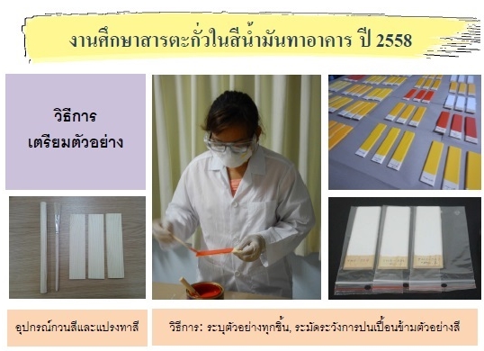 นางสาวอัฏฐพร ฤทธิชาติ นักวิจัยมูลนิธิบูรณะนิเวศ กล่าวว่า ปี 2558 นี้ มูลนิธิบูรณะนิเวศได้สำรวจตัวอย่างสีน้ำมันทาอาคาร 100 ตัวอย่าง จาก 56 ยี่ห้อ ซึ่งเป็นผลิตภัณฑ์ของ 35 บริษัท (โทนสีขาว 41 ตัวอย่างและโทนสีสด 59 ตัวอย่าง) พบมีผู้ประกอบการผลิตสีปลอดสารตะกั่วจำนวนเพิ่มขึ้น เมื่อเทียบกับผลการสำรวจตลาดสีเมื่อปี พ.ศ. 2556