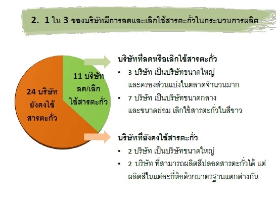 นอกจากนี้ ยังพบว่ามีผู้ผลิตสีจำนวน 1 ใน 3 หรือ 11 บริษัทใน 35 บริษัท ที่ลดใช้สารตะกั่วในการผลิตสีแล้ว และมีบางรายเลิกใช้สารตะกั่วในกลุ่มสีขาวและสีสดทุกยี่ห้อ