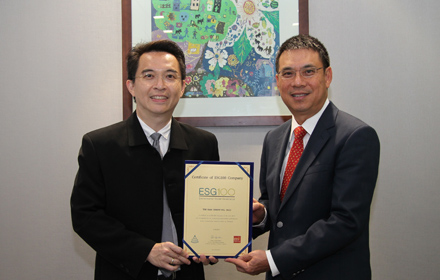 นายรุ่งโรจน์ รังสิโยภาส (ขวา) รองกรรมการผู้จัดการใหญ่ เอสซีจี รับมอบใบรับรอง ”ESG 100 Certificate” จาก ดร.พิพัฒน์ ยอดพฤติการ (ซ้าย) ผู้อำนวยการสถาบันไทยพัฒน์ ซึ่งสถาบันฯจัดทำขึ้น เพื่อมอบให้กับ 100 บริษัทที่มีความโดดเด่นในการดำเนินธุรกิจควบคู่ไปกับการดูแลสังคม ชุมชน และสิ่งแวดล้อม ตามหลักธรรมาภิบาลอย่างเคร่งครัด โดยคัดเลือกจาก 567 บริษัทจดทะเบียนในตลาดหลักทรัพย์แห่งประเทศไทย