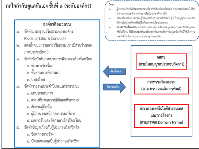 กลไกการกำกับดูแลชั้นที่ 1 ระดับองค์กรสื่อที่ผู้ประกอบวิชาชีพสื่อสังกัดอยู่นั้น มีหน้าที่ในการสร้างกลไกการกำกับดูแลกันเองภายในองค์กร (Ombudsman) รวมถึงจะต้องจัดทำมาตรฐานจริยธรรมเพื่อใช้เป็นหลักการและแนวปฏิบัติของ องค์กรและกระบวนการพิจารณาเรื่องร้องเรียนของผู้บริโภคสื่อ