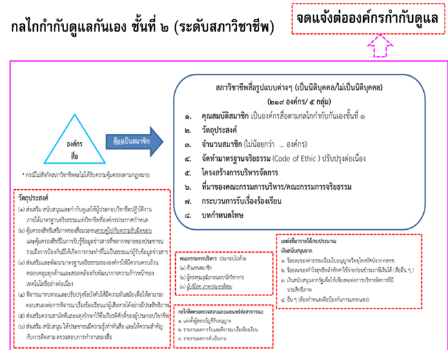 กำกับ ดูแลชั้นที่ 2 ในระดับสภาวิชาชีพ คปก.เสนอให้มีกฎหมายเพื่อรับรองการจัดตั้ง “สภาวิชาชีพสื่อมวลชน” ทำหน้าที่เป็นหน่วยงานกลางในการกำกับดูแลผู้ประกอบวิชาชีพสื่อมวลชนให้อยู่ภายใต้มรรยาทและมาตรฐานเดียวกัน และจะต้องกำหนดให้สภาวิชาชีพดังกล่าวไม่อยู่ภายใต้การกำกับดูแลของฝ่ายปกครอง เพื่อป้องกันการแทรกแซงจากกลุ่มผลประโยชน์ต่างๆ ซึ่งการกำกับดูแล “องค์กรสื่อ” ของสภาวิชาชีพจะต้องมีกระบวนการที่กำหนดให้องค์กรสื่อที่เป็นสมาชิกของสภาวิชาชีพสร้างกลไกและกระบวนการกำกับดูแลกันเองภายในองค์กร