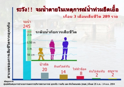 ด้าน นพ.ชาตรี เจริญชีวะกุล เลขาธิการสถาบันการแพทย์ฉุกเฉินแห่งชาติ (สพฉ.) ระบุถึงสถิติการเสียชีวิตจ ากสถานการณ์อุทกภัย ตั้งแต่วันที่ 25 ก.ค.ที่ผ่านมา จนถึงปัจจุบัน ในพื้นที่ประสบภัย 25 จังหวัด พบว่า 94.6% หรือ 245 ราย เสียชีวิตจากการจมน้ำ สาเหตุหลักคือลงเล่นน้ำในขณะที่น้ำไหลเชี่ยว และประชาชนที่ประกอบอาชีพทางน้ำ อาทิ หาปลา