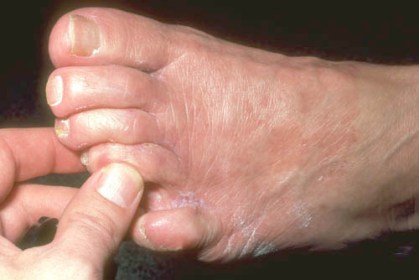 โรคติดต่อช่วงน้ำท่วม-หลังน้ำท่วม 1.โรคน้ำกัด เท้าจากเชื้อราและแผลพุพองเป็นหนองเกิดจากการย่ำน้ำหรือแช่น้ำที่มีเชื้อโรค หรืออับชื้นจากเสื้อผ้าและเครื่องแต่งกายที่ไม่สะอาดเป็นเวลานาน โดยจะมีอาการเท้าเปื่อย เป็นหนอง และเริ่มคันตามซอกนิ้วเท้า ผิวหนังลอกเป็นขุย จากนั้นผิวหนังจะพุพอง นิ้วเท้าหนาและแตก มีโอกาสเกิดโรคแทรกซ้อน คือผิวหนังอักเสบป้องกันได้ด้วยการเช็ดเท้าให้แห้ง