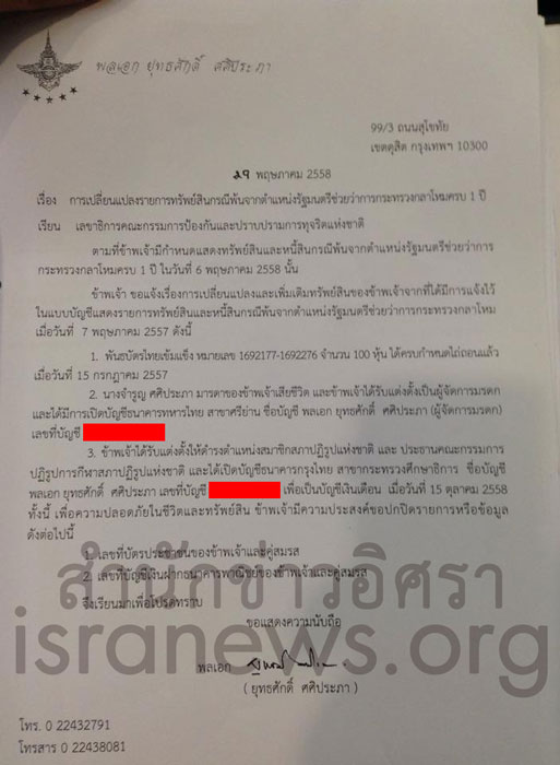 นางจำรูญ ศศิประภา มารดาของข้าพเจ้าเสียชีวิต และข้าพเจ้าได้รับแต่งตั้งเป็นผู้จัดการมรดก และได้มีการเปิดบัญชีธนาคารทหารไทย สาขาศรีย่าน ชื่อบัญชี พล.อ.ยุทธศักดิ์ ศศิประภา (ผู้จัดการมรดก) เลขที่บัญชี 041-2-569xx-x