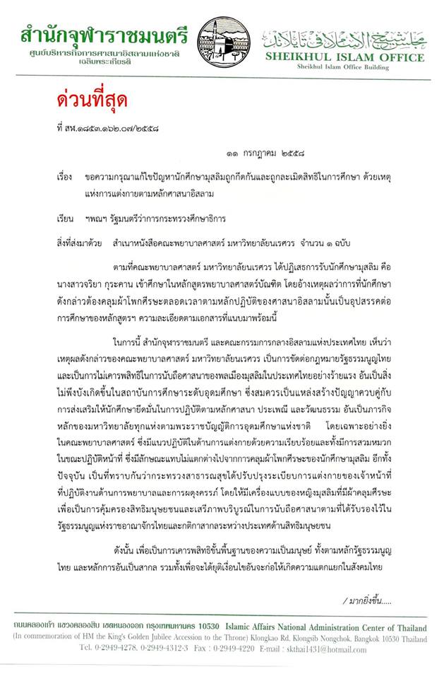 จากกรณี มหาวิทยาลัยนเรศวร ถูกวิพากษ์วิจารณ์อย่างหนัก ต่อกรณีการตัดสิทธิ์เข้าเรียนของนิสิตหญิงรายหนึ่งในหลักสูตรพยาบาลศาสตรบัณฑิต คณะพยาบาลศาสตร์ มหาวิทยาลัยนเรศวร เนื่องจากนิสิตหญิงรายนี้นับถือศาสนาอิสลาม จะต้องโพกผ้าคลุมศีรษะตลอดเวลา ไม่สามารถถอดผ้าคลุมศรีษะออกได้ ทำให้เป็นอุปสรรคต่อการศึกษาหลักสูตรนี้ในช่วงการฝึกปฏิบัติที่ต้องสวมเครื่องแบบฝึกปฏิบัติของโรงพยาบาลต่างๆ