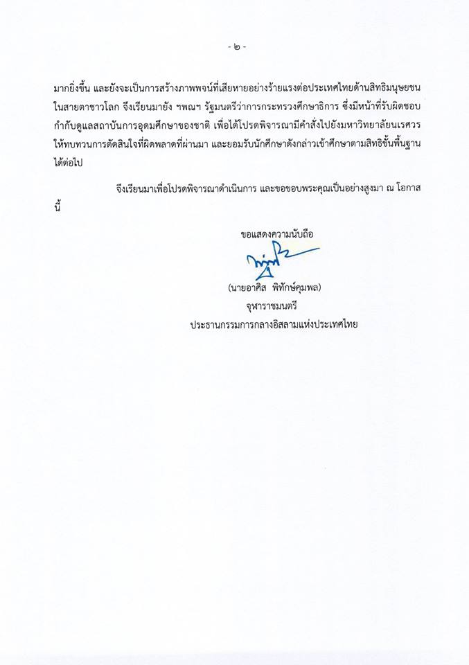 ผู้สื่อข่าวสำนักข่าวอิศรา รายงานว่า ล่าสุด "แฟนเพจ สำนักจุฬาราชมนตรี" ได้เผยแพร่หนังสือที่ นายอาศิล พิทักษ์คุมพล จุฬาราชมนตรี ประธานกรรมการกลางอิสลามแห่งประเทศไทย ทำถึง รัฐมนตรีว่าการกระทรวงศึกษาธิการ เพื่อขอให้มีคำสั่งไปยังมหาวิทยาลัยนเรศวร ให้ทบทวนการตัดสินใจเรื่องดังกล่าว และยอมรับนิสิตรายนี้เข้าศึกษาตามสิทธิขั้นพื้นฐาน