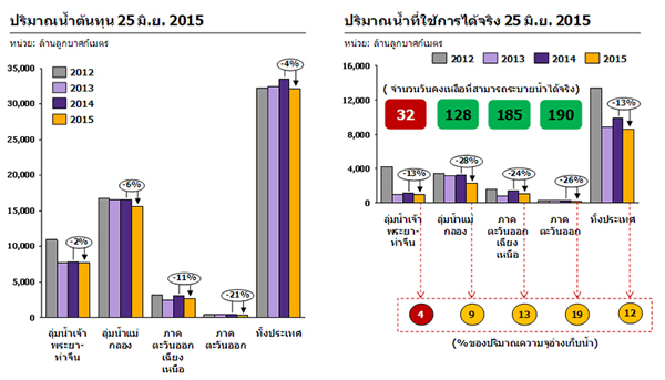 สถานการณ์ภัยแล้งในปัจจุบันเป็นผลมาจากปริมาณน้ำต้นทุนในเขื่อนหลายแห่งต่ำ ประกอบกับภาวะฝนทิ้งช่วงเนื่องจากอิทธิพลของ El Nino ที่กำลังเกิดขึ้น จากข้อมูลของกรมป้องกันและบรรเทาสาธารณภัยเมื่อวันที่ 25 มิถุนายน 2015 ล่าสุดมีพื้นที่ประสบภัยแล้วกว่า 20 จังหวัดทั่วประเทศ ซึ่งอยู่ทางภาคเหนือและภาคตะวันออกเฉียงเหนือเป็นส่วนใหญ่ เช่น จังหวัดนครสวรรค์ พิษณุโลก อุตรดิตถ์ ตาก น่าน ลพบุรี นครราชสีมา ขอนแก่น ชัยภูมิ สกลนคร อำนาจเจริญ สุรินทร์ เป็นต้น เนื่องจากภัยแล้งนี้เกิดขึ้นช่วงกลางฤดูฝน คือ ตั้งแต่กลางเดือน มิ.ย. – ก.ค. โดยรับอิทธิพลจากความแปรปรวนสภาพภูมิอากาศโลก จึงเรียกอีกนัยหนึ่งว่าเป็น “ภัยแล้งนอกฤดูกาล” ซึ่งภัยแล้งในลักษณะปัจจุบัน ทำให้ปริมาณฝนเฉลี่ยทั้งประเทศต่ำกว่าค่าปกติราว 46%ืและปริมาณน้ำต้นทุนทั้งประเทศค่อนข้างต่ำอยู่ที่ราว 45% ของปริมาณความจุเขื่อนทั้งประเทศ