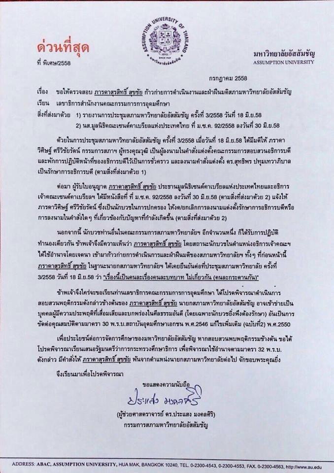 ขณะเดียวกัน ผู้ช่วยศาสตราจารย์ ดร.ประแสง มงคลศิริ กรรมการสภามหาวิทยาลัยอัสสัมชัญ ส่งหนังสือถึงเลขาธิการสำนักงานคณะกรรมการอุดมศึกษา ขอให้ตรวจสอบภราดาสุรสิทธิ์ สุขชัย ก้าวก่ายการดำเนินงานเเละฝ่าฝืนมติสภามหาวิทยาลัยอัสสัมชัญ โดยขอให้เลขาธิการคณะกรรมการอุดมศึกษาดำเนินการสอบสวนพฤติกรรมของ ภราดาสุรสิทธิ์ สุขชัย นายกสภามหาวิทยาลัยอัสสัมชัญ อาจเข้าข่ายเป้นบุคคลผู้มีความประพฤติที่เสื่อมเสียเเละบกพร่องในศีลธรมมอันดี (โดยเฉพาะนักบวชยิ่งต้องพึงรักษา) อันเป็นการขัดต่อคุณสมบัติ มาตรา30 พ.ร.บ.สถาบันอุดมศึกษาเอกชน พ.ศ.2546 แก้ไขเพิ่มเติม (ฉบับที่2) พ.ศ.2550