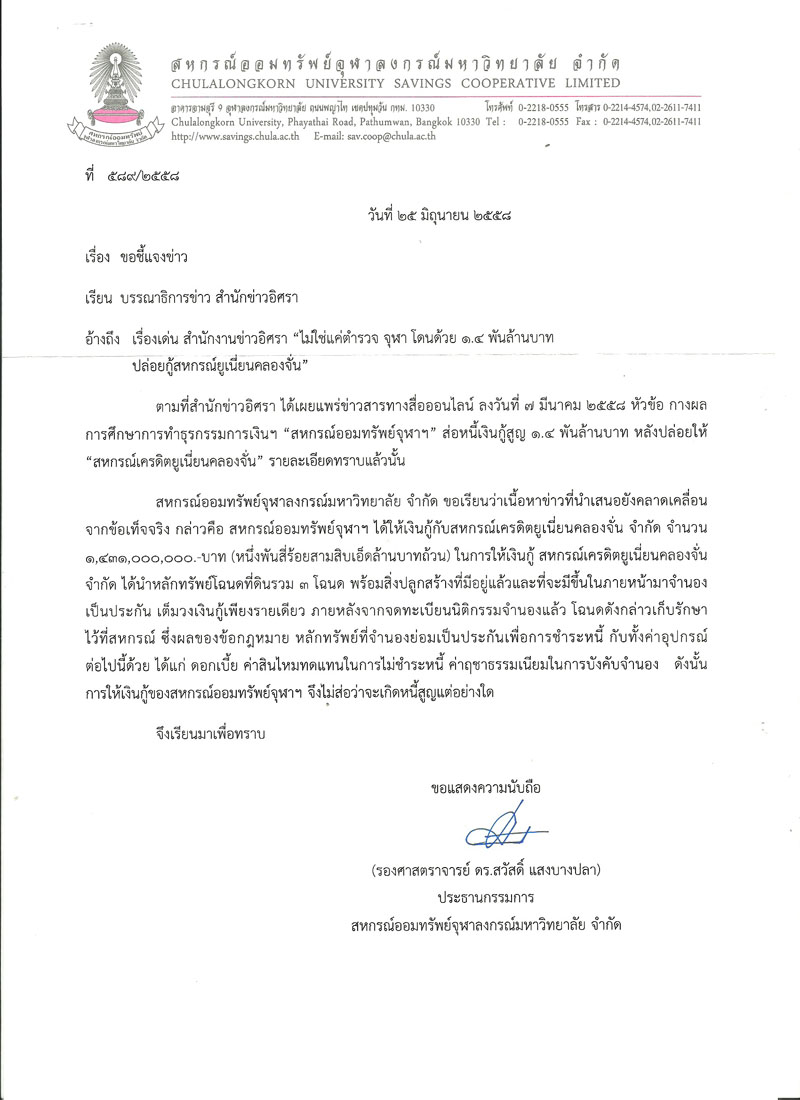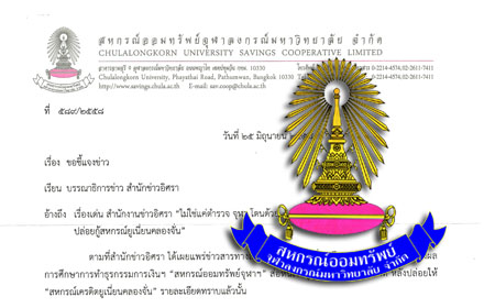 เมื่อวันที่ 27 ก.ค.58 สำนักข่าวอิศราได้รับหนังสือชี้แจงข้อเท็จจริงจาก รศ.ดร.สวัสดิ์ แสงบางปลา ประธานกรรมการ สหกรณ์ออมทรัพย์จุฬาลงกรณ์มหาวิทยาลัย ระบุว่า จากกรณีสำนักข่าวอิศราได้เผยแพร่ข่าวสารทางสื่อออนไลน์วันที่ 7 มีนาคม 2558 ในหัวข้อ “กางผลการศึกษาการทำธุรกรรมการเงินฯ “สหกรณ์ออมทรัพย์จุฬาฯ” ส่อหนี้เงินกู้สูญ 1.4 พันล้าน หลังปล่อยให้ “สหกรณ์เครดิตยูเนี่ยนคลองจั่น”