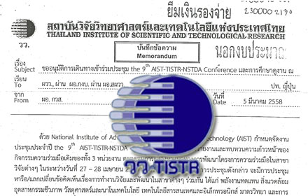 คณะที่สาม ศึกษาดูงาน ณ หน่วยงาน AIST เมือง Tsukuba และ AIST กรุงโตเกียว ประเทศญี่ปุ่น ระหว่างวันที่ 26-29 ประกอบด้วย ผู้บริหาร และเจ้าหน้าที่ รวม 16 คน และ อนุมัติการเดินทางของ ดร.อาภารัตน์ มหาขันธ์ จังหวัดฟูกุชิมา,AIST เมือง Tsukuba และ การประชุมฯ ณ AIST กรุงโตเกียว ประเทศญี่ปุ่นระหว่างวันที่ 23-29 เม.ย.58 I รวมเป็นเงิน 987,000 บาท