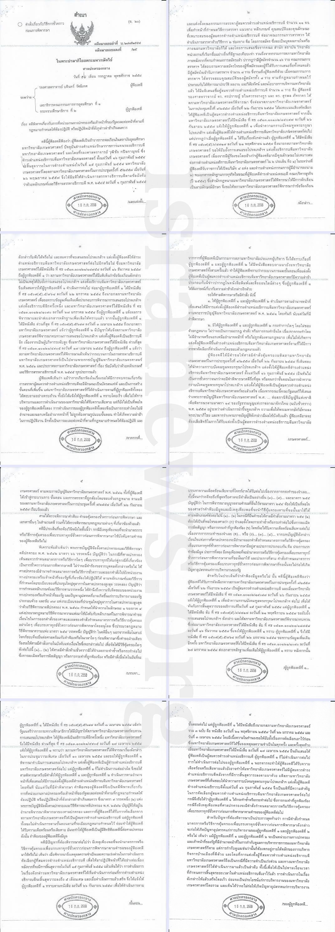สาระสำคัญ ศาลปกครองกลาง มีคำสั่งคุ้มครองชั่วคราว ห้ามสภา มก.ดำเนินการใดๆ อันมีผลเป็นการเปลี่ยนแปลงมติสภา มก. ในการประชุมครั้งที่9/2557 เมื่อวันที่ 22 กันยายน.2557 ที่เห็นชอบให้นำความกราบบังคมทูลพระกรุณาโปรดเกล้าแต่งตั้ง รศ.ดร.บดินทร์ ดำรงตำแหน่งอธิการบดี มก. ตั้งแต่วันที่ 16 ก.พ.2558 เป็นต้นไป เป็นการชั่วคราวจนกว่าจะได้มีการกราบบังคมทูลพระกรุณาโปรดเกล้าแต่งตั้งให้ รศ.ดร.บดินทร์ เป็นอธิการบดี มก. หรือจนกว่าศาลจะมีคำสั่งเป็นอย่างอื่น