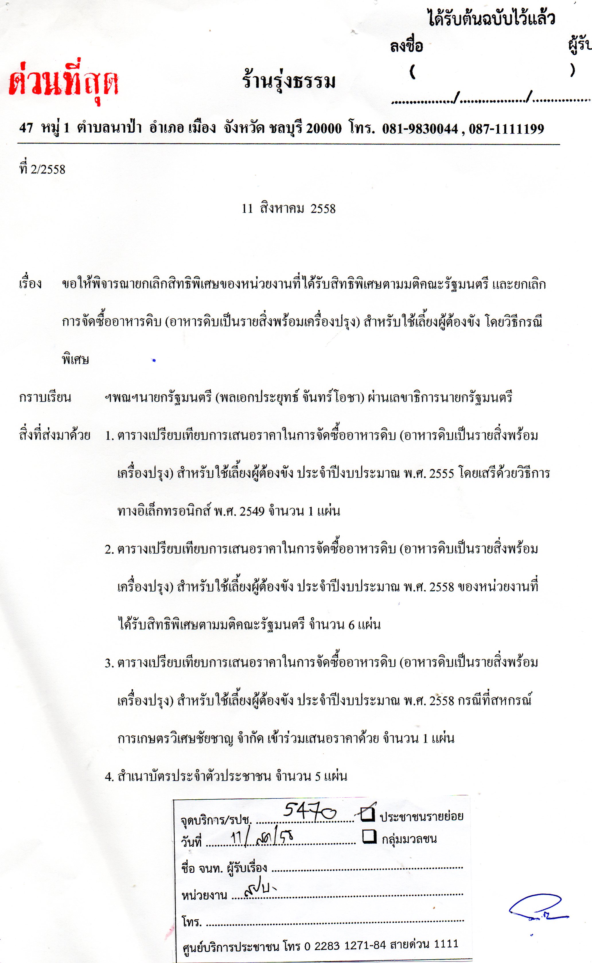 สำนักข่าวอิศรา www.isranews.org รายงานว่า เมื่อ 11 ส.ค.58 ที่ผ่านมา ผู้ประกอบการรายย่อยได้แก่ นายรุจน์ ทรงแสงธรรม นายปราโมทย์ เจริญลาภนพรัตน์ นายสายัณ อบเชย นายกิตติศักดิ์ อนันต์พิพัฒน์กิจ และนายคฑายุทธ แซ่เตีย ได้ส่งหนังสือร้องเรียนถึงพล.อ.ประยุทธ์ จันทร์โอชา นายกรัฐมนตรี ขอให้พิจารณาสั่งยกเลิกสิทธิพิเศษขององค์การตลาด กระทรวง มหาดไทย องค์การตลาดเพื่อเกษตรกร องค์การคลังสินค้า และชุมนุมสหกรณ์การเกษตรแห่งประเทศไทย จำกัด ในการเสนอราคาการจัดซื้ออาหารดิบ (อาหารดิบเป็นรายสิ่งพร้อมเครื่องปรุง) สำหรับใช้เลี้ยงผู้ต้องขัง พร้อมทั้งมีบัญชาสั่งการให้กรมราชทัณฑ์ยกเลิกการจัดซื้ออาหารดิบ (อาหารดิบเป็นรายสิ่งพร้อมเครื่องปรุง) สำหรับใช้เลี้ยงผู้ต้องขัง โดยวิธีกรณีพิเศษ กรณีที่ไม่มีเหตุผลและความจำเป็นเท่าที่ควร