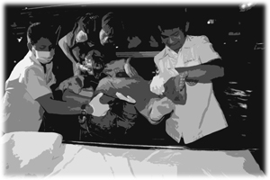 บรรยายภาพ : เจ้าหน้าที่โรงพยาบาลศูนย์ยะลากำลังลำเลียงผู้ได้รับบาดเจ็บจากเหตุระเบิดส่งห้องไอ.ซี.ยู. (ภาพโดย อะหมัด รามันห์สิริวงศ์)