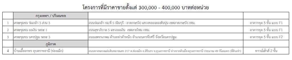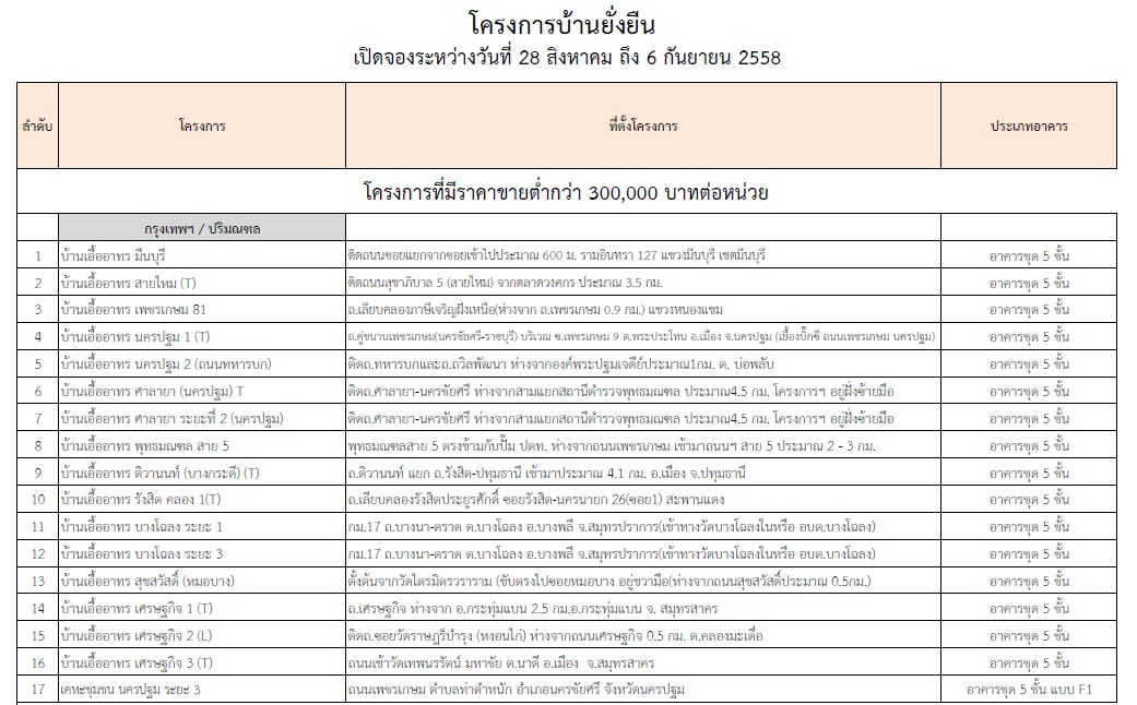 โครงการบ้านยั่งยืน มีจำนวนทั้งสิ้น 244 โครงการ 13,583 หน่วยทั่วประเทศ แบ่งออกเป็น อาคารชุด 3-5 ชั้น(ขนาด 33 ตร.ม.) บ้านเดี่ยว บ้านแฝด และทาวน์เฮาส์ และจำแนกตามราคาดังนี้ 1.ระดับราคาขายต่อหน่วยต่ำกว่า 300,000 บาท (17 โครงการ จำนวน 736 หน่วย), 2.ระดับราคาขายต่อหน่วยตั้งแต่ 300,001-400,000 บาท (11 โครงการ 1,117 หน่วย), 3.ระดับราคาขายต่อหน่วยตั้งแต่ 400,001-500,000 บาท ( 67 โครงการ 9,088 หน่วย) และ 4.ระดับราคาขายต่อหน่วยสูงกว่า 500,000 บาท (149 โครงการ 2,642 หน่วย)