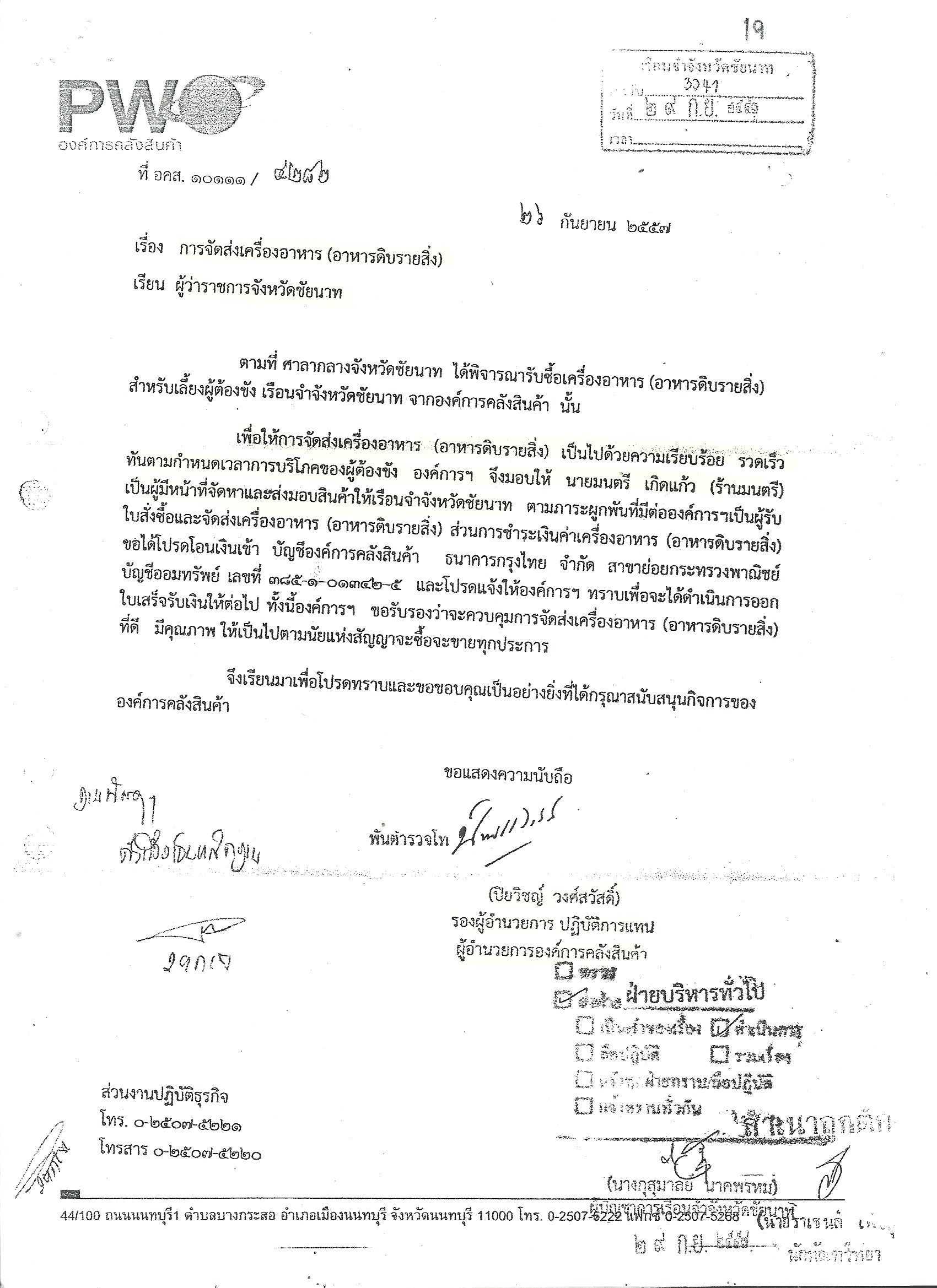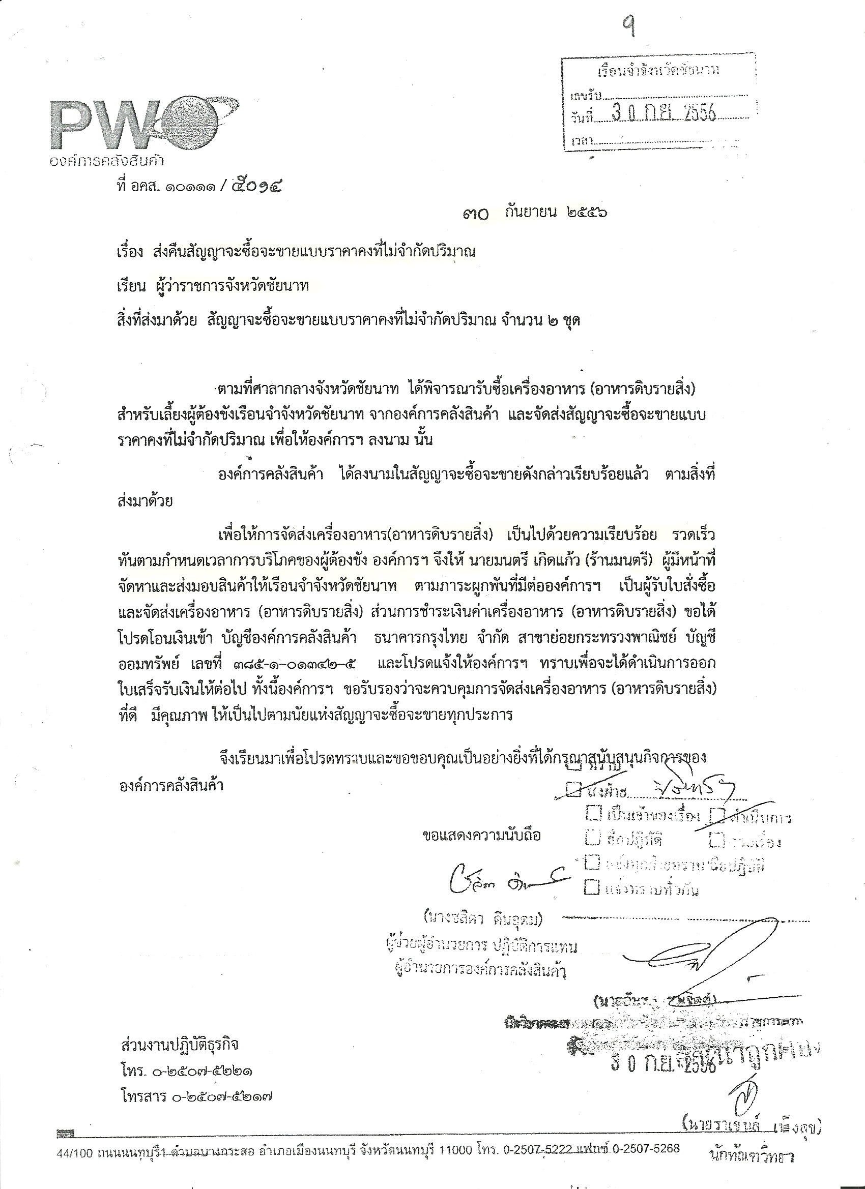 30 ก.ย.56 องค์การคลังสินค้า หนังสือถึงผู้ว่าฯชัยนาท แจ้งว่าได้แต่งตั้งให้นายมนตรี เกิดแก้ว เป็นตัวแทนในการจำหน่ายอาหารดิบให้กับเรือนจำจังหวัดชัยนาท