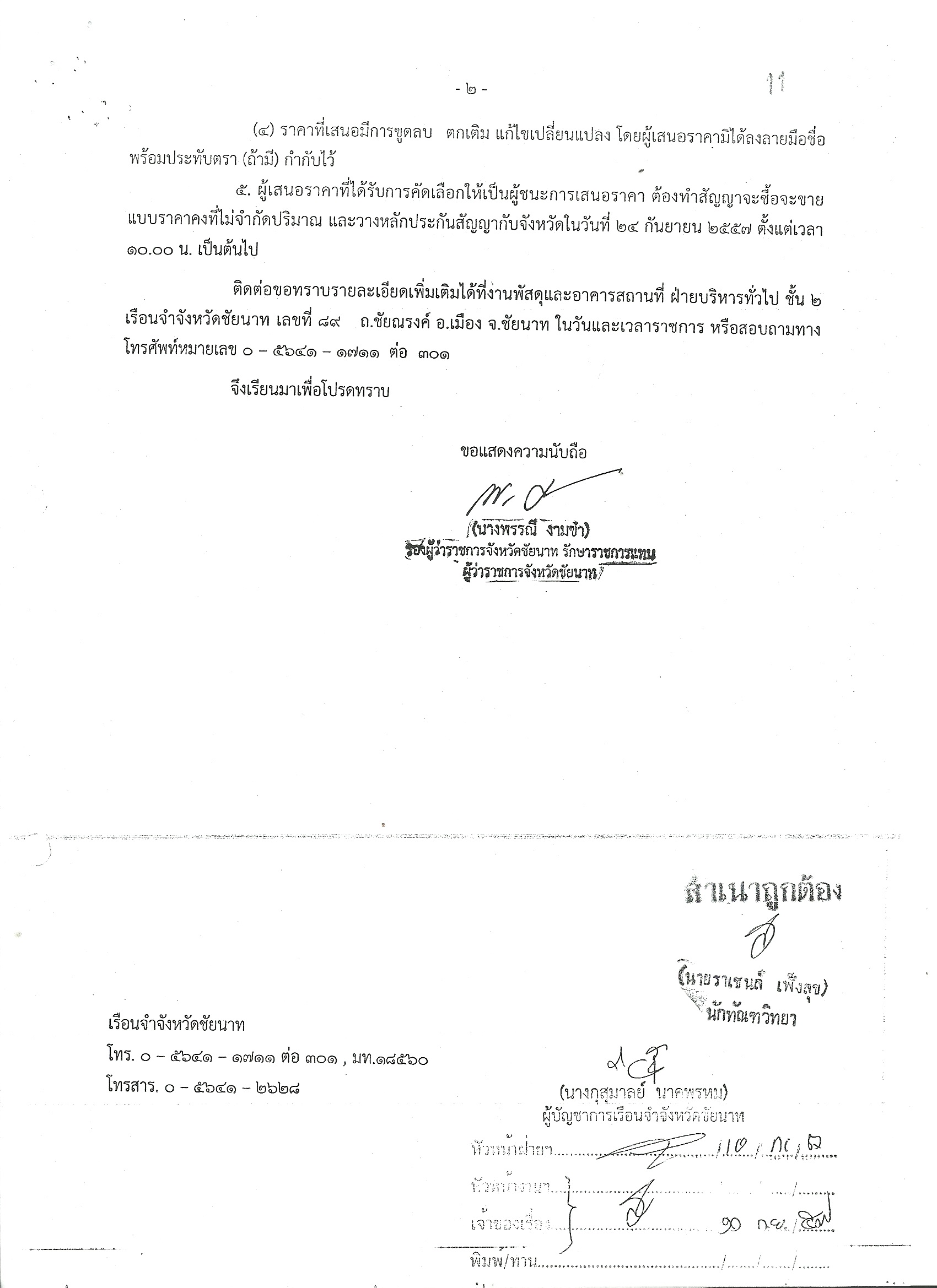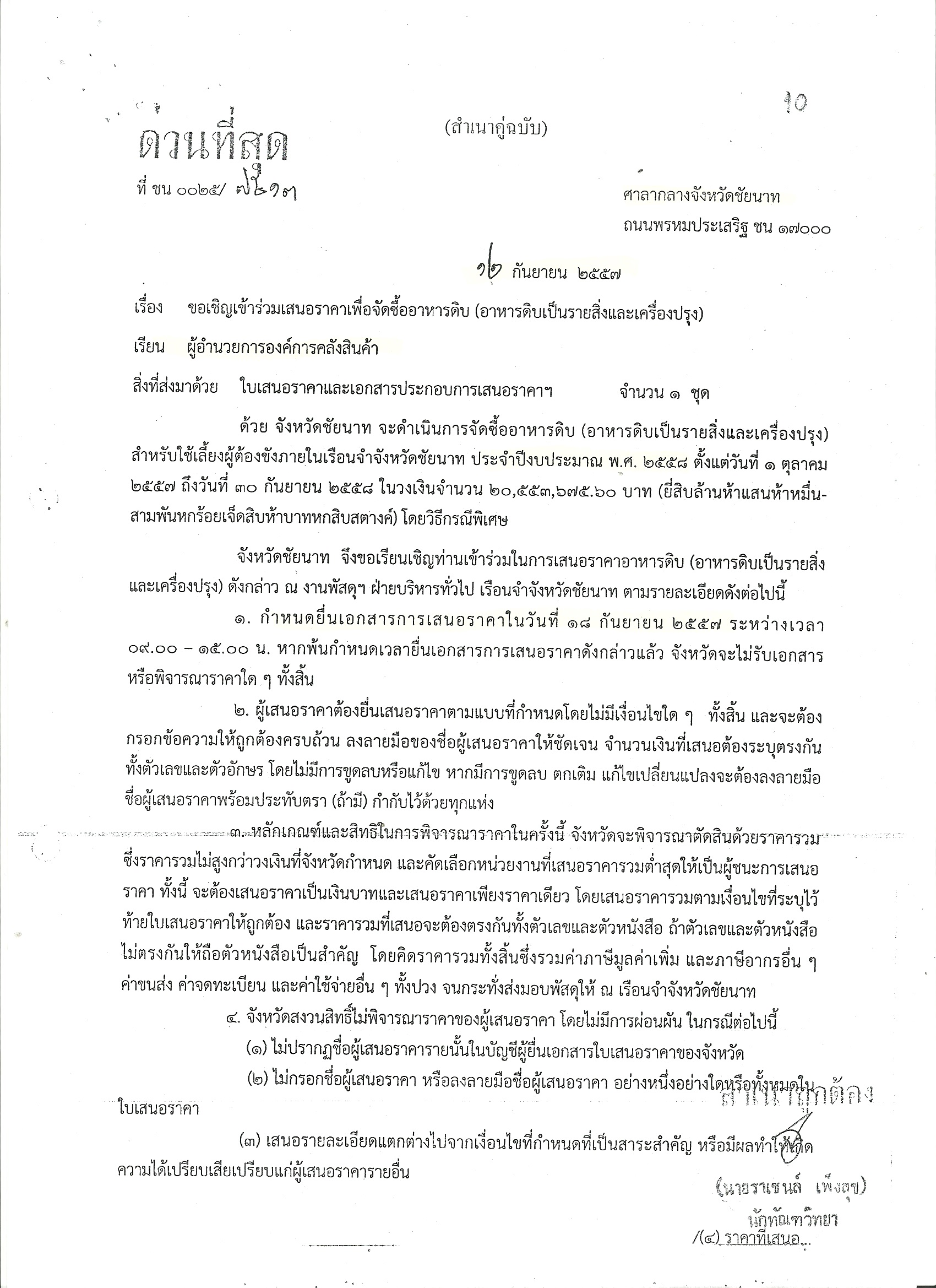26 ก.ย.56 เรือนจำจังหวัดชัยนาท มีหนังสือแจ้งให้องค์การคลังสินค้า องค์การตลาดเพื่อเกษตรกร องค์การตลาด กระทรวงมหาดไทย และชุมนุมสหกรณ์การเกษตรแห่งประเทศไทย จำกัด ให้เข้าร่วมเสนอราคาในวันที่ 27 กันยายน 2556 เวลา 13.00 น.-13.30 น. และกำหนดเปิดซองและพิจารณาใบเสนอราคาในเวลา 14.00 น.-14.30 น.
