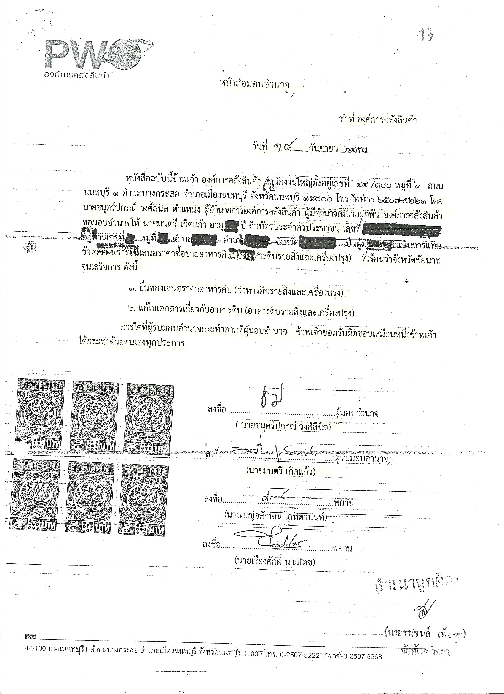 18 ก.ย.57 องค์การคลังสินค้า โดยนายชนุตร์ปกรณ์ วงศ์สีนิล ผู้อำนวยการองค์การคลังสินค้า ทำหนังสือมอบอำนาจให้นายมนตรี เกิดแก้ว เป็นผู้ยื่นซองเสนอราคา และแก้ไขเอกสารเกี่ยวกับอาหารดิบ