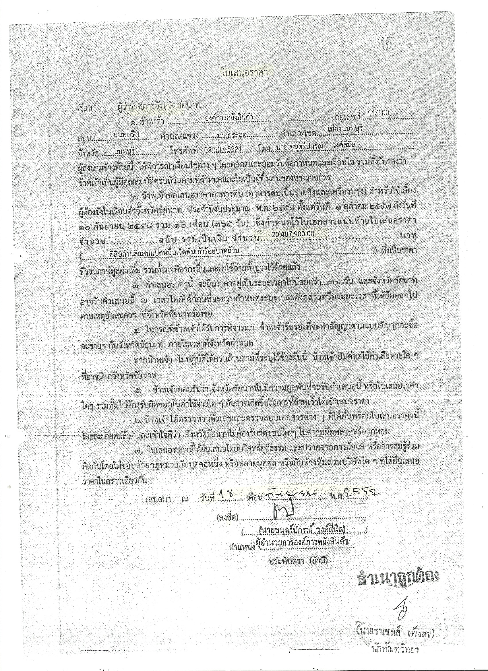 27 ก.ย.56 นายวิชัย นาคพรอำนวย ผู้รับมอบอำนาจจากองค์การตลาด ส่งใบเสนอราคาต่อผู้ว่าราชการจังหวัดนครสวรรค์