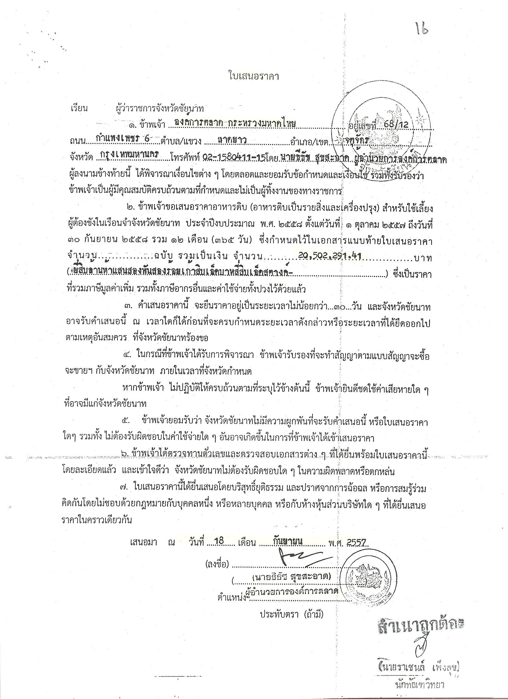 1. องค์การคลังสินค้า เสนอราคากับเรือนจำจังหวัดชัยนาท เป็นจำนวนเงิน 20,120,000 บาท (ต่ำกว่าราคากลาง 8,290 บาท)