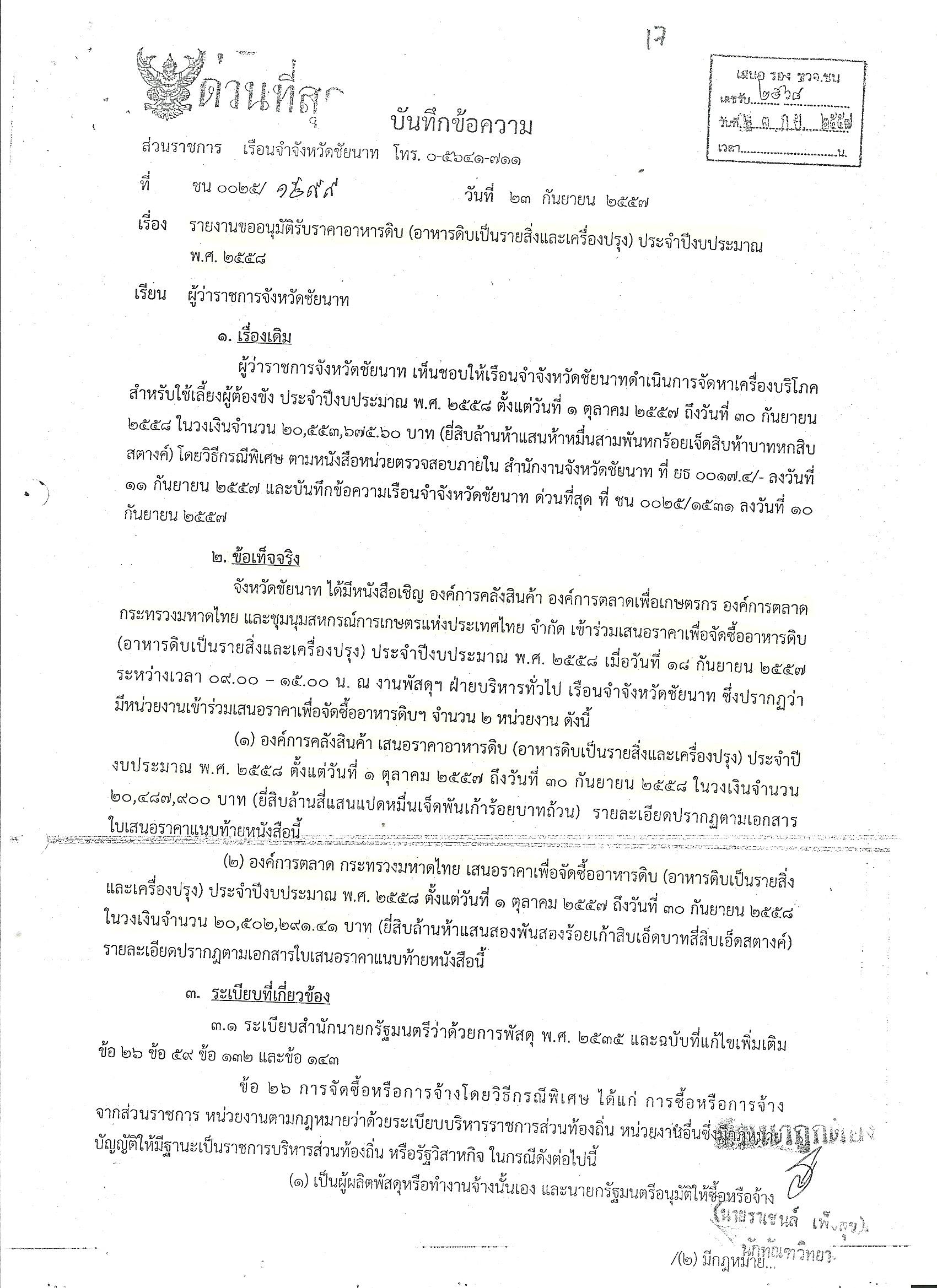 23 ก.ย.57 นางสุกุมาลย์ นาคพรหม ผู้บัญชาการเรือนจำจังหวัดชัยนาท ทำบันทึกขออนุมัติจัดซื้ออาหารดิบต่อผู้ว่าฯ ระบุว่า องค์การคลังสินค้า เสนอราคาต่ำกว่ารายอื่น (องค์การตลาด) และต่ำกว่าวงเงินงบประมาณ เป็นเงิน 65,775.60 บาท จึงเห็นควรจัดซื้ออาหารดิบจากองค์การคลังสินค้า