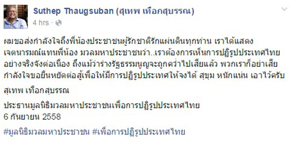 ขณะที่นายสุเทพ เทือกสุบรรณ ประธานมูลนิธิมวลมหาประชาชนเพื่อการปฏิรูปประเทศไทย (มูลนิธิ กปปส.) โพสต์ข้อความผ่านเฟซบุ๊กแฟนเพจ “Suthep Thaugsuban (สุเทพ เทือกสุบรรณ)” ระบุถึงกรณี สปช. ไม่รับร่างรัฐธรรมนูญเช่นกันว่า ขอส่งกำลังใจถึงพี่น้องประชาชนผู้รักชาติรักแผ่นดินทุกท่าน เราได้แสดงเจตนารมณ์แทนพี่น้อง มวลมหาประชาชนว่า เราต้องการเห็นการปฏิรูปประเทศไทยอย่างจริงจังต่อเนื่อง