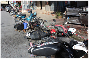In another incident, one pillion rider was spotted by a defence volunteer putting a bag, suspected to be a bomb, in front of Saeb Isarn food shop on Pung Muang 5 Road. The volunteer yelled at him and ordered him to stop but the suspect quickly escaped in a waiting motorcycle. Shortly afterward, an explosion went off at the spot where the suspected bag was dropped.