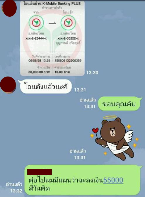 (การพูดคุยผ่านเเอปพลิเคชันไลน์ระหว่างผู้เสียหายกับ น.ส.บี)