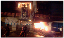 บรรยายภาพ : เหตุการณ์คนร้ายวางระเบิดเพลิงในร้านขายของชำกลางเมืองนราธิวาสจนเกิดเพลิงไหม้ใหญ่และมีผู้เสียชีวิต เมื่อคืนวันอาทิตย์ที่ 23 ต.ค. ก่อนเกิดเหตุป่วน 18 จุดใน 8 อำเภอในอีก 7 วันต่อมา (เอื้อเฟื้อภาพโดย คุณสุริยะ ตะวันฉาย)