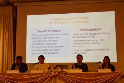 “หากเทียบเคียงอุตสาหกรรมกุ้งกับทูน่า จะเห็นได้อุตสาหกรรมทูน่ากระป๋อง ร้อยละ 95 ผลิตเพื่อการส่งออก ดังนั้นจึงมีความกดดันจากต่างประเทศเพื่อซื้อ จึงได้ติดตาม ควบคุมคุณภาพ และมีมาตรฐานสูงในการใช้แรงงาน และดูแลสภาพแวดล้อม แตกต่างจากอุตสาหกรรมกุ้ง ร้อยละ 50 ผลิตเพื่อบริโภคภายในประเทศ อีกร้อยละ 50 ผลิตเพื่อการส่งออก ทำให้มีความกดดันน้อยในการควบคุมมาตรฐานและการใช้แรงงานเด็ก กฎระเบียบต่าง ๆ ถึงแม้ภาครัฐจะมีความพยายามติดตาม แต่ยังพบอัตราเสี่ยงสูงในการละเมิด” Ms.Salaz-Lozac’h กล่าว