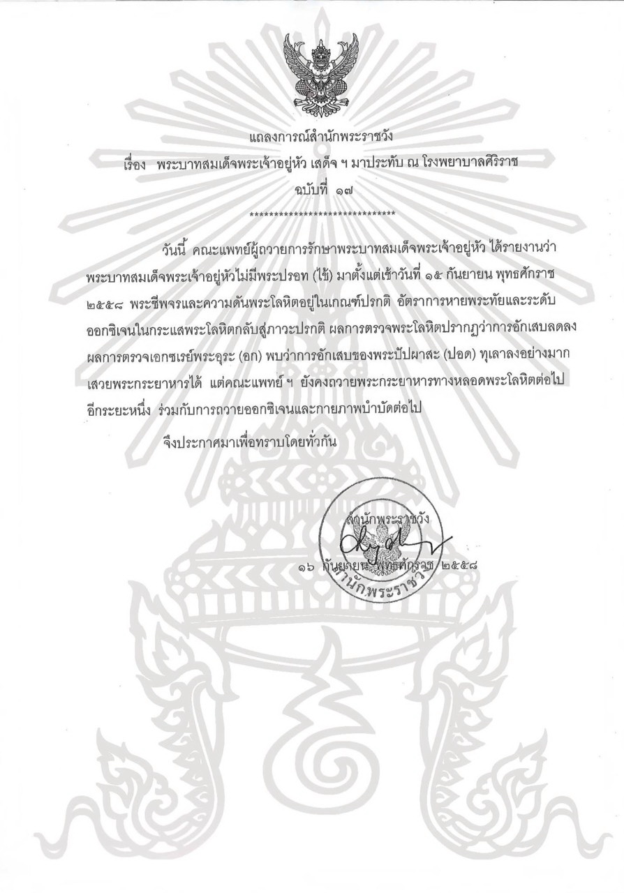 วันที่ 16 กันยายน คณะแพทย์ผู้ถวายการรักษาพระบาทสมเด็จพระเจ้าอยู่หัว ได้รายงานว่า พระบาทสมเด็จพระเจ้าอยู่หัวไม่มีพระปรอท (ไข้) มาตั้งแต่เช้าวันที่ 15 กันยายน พุทธศักราช 2558 พระชีพจรและความดันโลหิตอยู่ในเกณฑ์ปรกติ อัตราการหายพระทัยและระดับออกซิเจนในกระแสพระโลหิตกลับสู่ภาวะปรกติ ผลการตรวจพระโลหิตปรากฎว่า การอักเสบลดลง ผลการตรวจเอกซเรย์พระอุระ (อก) พบว่า การอักเสบของพระปัปผาสะ (ปอด) ทุเลาลงอย่างมาก เสวยพระกระยาหารได้ แต่คณะแพทย์ยังคงถวายพระกระยาหารทางหลอดพระโลหิตต่อไป อีกระยะหนึ่ง ร่วมกับการถ่ายออกซิเจนและกายภาพบำบัดต่อไป
