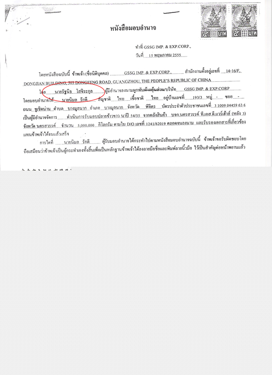 ส่วนเช็คจำนวนหลายใบ ที่มีการสั่งจ่ายให้กับกรมการค้าต่างประเทศ เพื่อชำระเป็นค่าข้าว ถูกระบุว่า ผู้สั่งซื้อคือ "นายสมคิด เอื้อนสุภา"