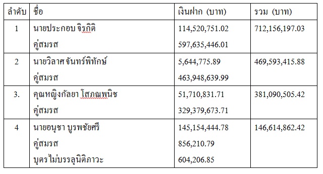 1.นายประกอบ จิรกิติ อดีต ส.ส.กรุงเทพฯ พรรคประชาธิปัตย์ และคู่สมรส มีเงินฝาก 1,056,096,947 บาท