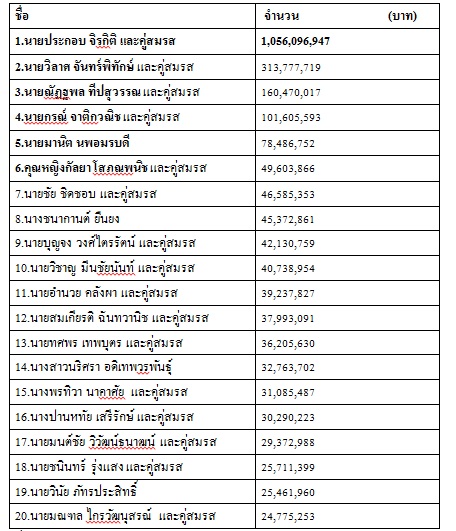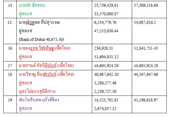 นายบุญจง วงศ์ไตรรัตน์ อดีตรัฐมนตรีช่วยว่าการกระทรวงมหาดไทย และคู่สมรส 42,130,759 บาท 9.นายวิชาญ มีนชัยนันท์ อดีต ส.ส.กรุงเทพฯ พรรคเพื่อไทย และคู่สมรส 40,738,954 บาท