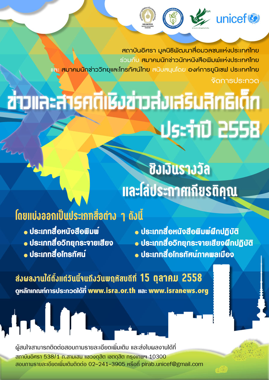 สถาบันอิศรา มูลนิธิพัฒนาสื่อมวลชนแห่งประเทศไทย ร่วมกับ สมาคมนักข่าวนักหนังสือพิมพ์แห่งประเทศไทย และ สมาคมนักข่าววิทยุและโทรทัศน์ไทย สนับสนุนโดย องค์การยูนิเซฟ ประเทศไทย จัดการประกวดข่าวและสารดคีเชิงข่าวส่งเสริมสิทธิเด็กประจำปี 2558 โดยแบ่งออกเป็นประเภทต่างๆ คือ ประเภทสื่อหนังสือพิมพ์ ประเภทสื่อวิทยุกระจายเสียง ประเภทสื่อโทรทัศน์ ประเภทสื่อหนังสือพิมพ์ฝึกปฏิบัติ ประเภทสื่อวิทยุกระจายเสียงฝึกปฏิบัติ ประเภทสื่อโทรทัศน์ภาคพลเมือง ชิงเงินรางวัล และโล่ประกาศเกียรติคุณ