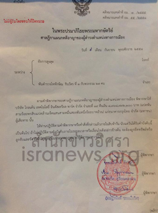 อย่างไรก็ดีมีอยู่ 2 บริษัทที่ไม่มีผู้รับ ศาลฎีกาฯจึงได้ปิดหมายไว้ ระบุว่า ตามคำพิพากษาของศาลฎีกาฯ พิพากษาให้บริษัท โกลเด้น คืนเงิน 8,368,732,100 บาท หรือกว่า 8.3 พันล้านบาท และบริษัท อาร์เคฯ คืนเงิน 450 ล้านบาท แก่ธนาคารกรุงไทย ผู้เสียหาย โดยให้ปฏิบัติตามคำพิพากษาหรือคำสั่งดังกล่าวภายใน 15 วัน นับแต่วันที่ได้รับคำสั่งนี้เป็นต้นไป ถ้าไม่ปฏิบัติตามคำบังคับภายในระยะเวลาหรือเงื่อนไขดังกล่าวข้างต้น จะต้องถูกยึดทรัพย์หรือถูกจับและขัง ดังที่บัญญัติไว้ในประมวลกฎหมายวิธีพิจารณาความแพ่ง (ดูเอกสารประกอบ)