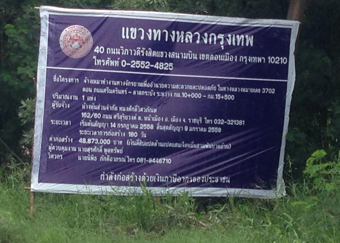 กรณีสำนักข่าวอิศรา www.isranews.org เปิดเผยข้อมูลโครงการก่อสร้างเส้นทางจักรยาน บริเวณทางคู่ขนานมอเตอร์เวย์สายชลบุรีด้านทิศใต้ บนทางหลวงหมายเลข 3702 ระยะทาง 5.5 กม. ระหว่าง กม.10+000 – กม.15+500 ซึ่งพบว่า มีการติดป้ายชื่อโครงการแล้ว ระบุวงเงิน 49,005,336.75 บาท พร้อมข้อความว่า กำลังก่อสร้างด้วยเงินภาษีอากรของประชาชน